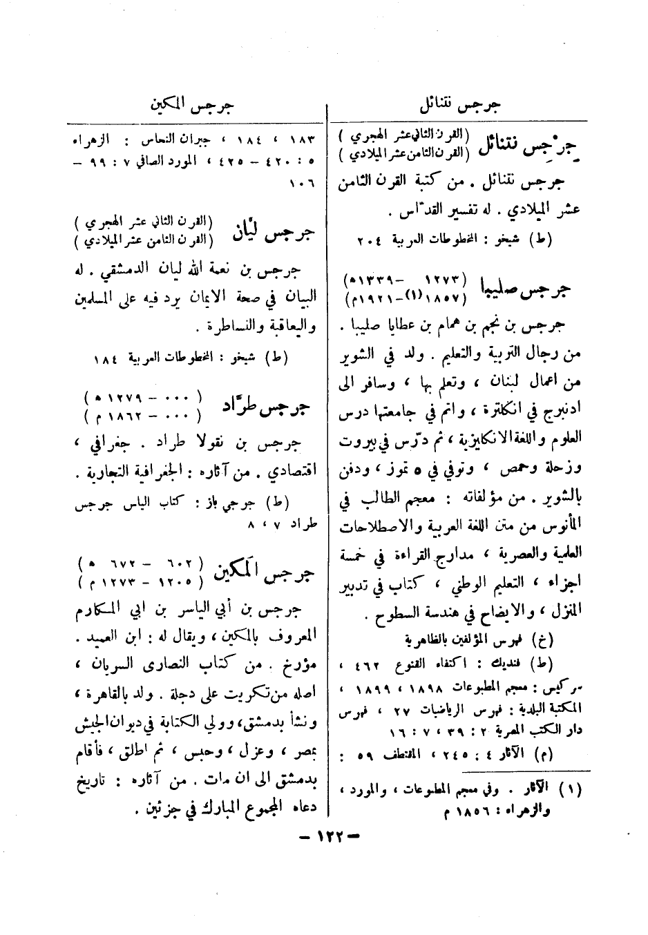 (ط) جرجي باز: كتاب الياس جرجس طراد 7، 8 جرجس المكين (602 - 672 هـ) (1205 - 1273 م) جرجس بن أبي الياسر بن ابي المكارم المعروف بالمكين، ويقال له: ابن العميد.