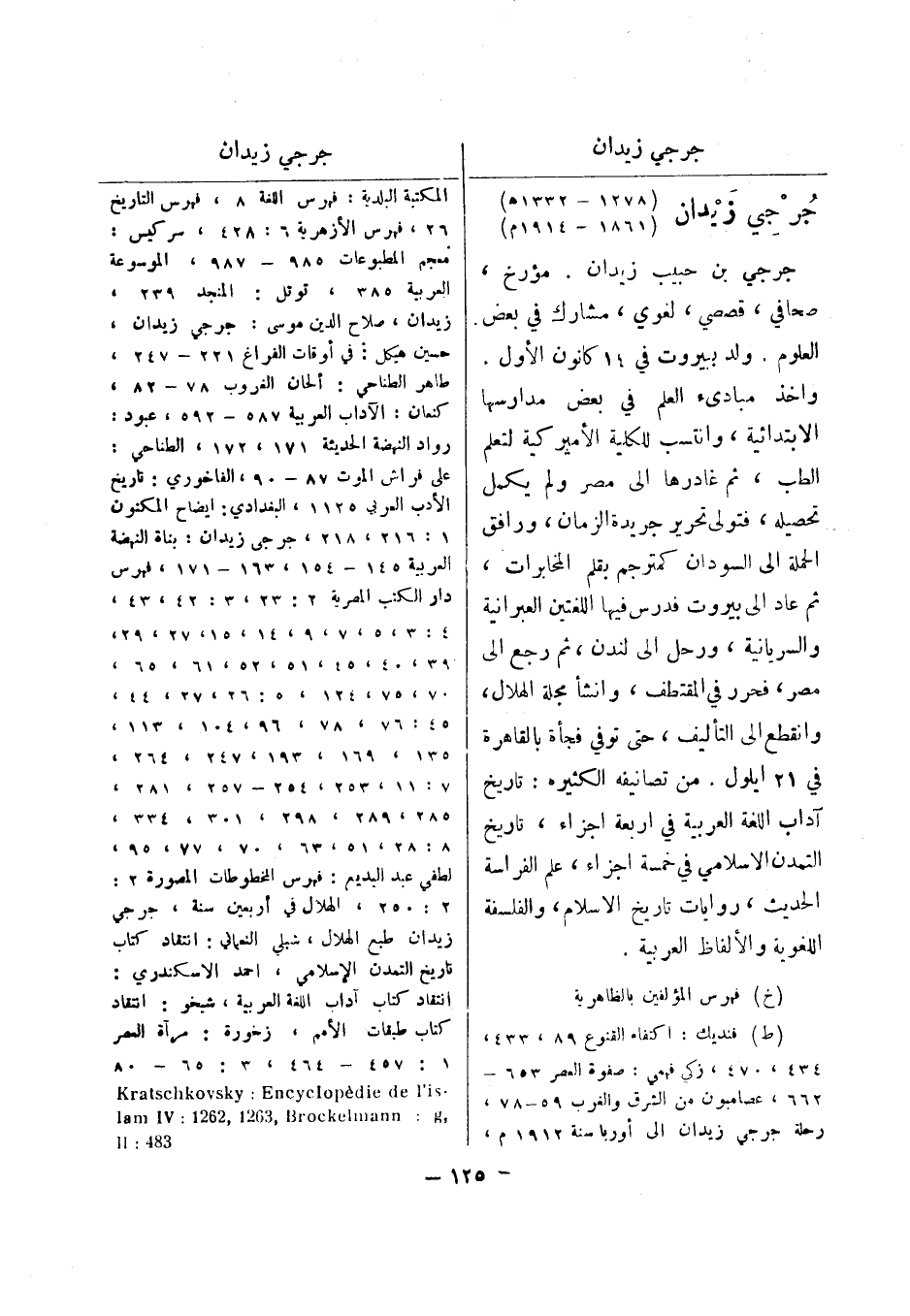 العربية 145 - 154، 163 - 171، فهرس دار الكتب المصرية 2: 23، 3: 42، 43، 4: 3، 5، 7، 9، 14، 15، 27، 29، 39، 40، 45، 51، 52، 61، 65، 70، 75، 124، 5: 26، 27، 44، 45: 76، 78، 96، 104، 113، 135، 169، 193، 247، 264، 7: 11، 253، 254 - 257، 281، 285، 289، 298، 301، 334، 8: 28، 51، 63، 70، 77، 95، لطفي عبد البديع: فهرس المخطوطات المصورة 2: 2: 250، الهلال في أربعين سنة، جرجي زيدان طبع الهلال، شبلي النعماني: انتقاد كتاب تاريخ التمدن الاسلامي، احمد الاسكندري: انتقاد كتاب آداب اللغة العربية، شيخو: انتقاد كتاب طبقات الامم، زخورة: مرآة العصر 1: 457 - 464، 3: 65 - 80 Kratschkovsky: Encyclopedie de l ' is , Iam IV: 2621 , 3621 , Brockelmann: g 483: II