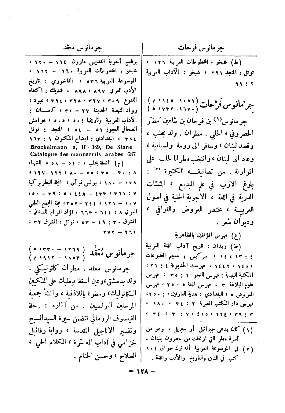 (ط) شيخو: المخطوطات العربية 126، توتل: المنجد 291، شيخو: الآداب العربية 2: 99 جرمانوس فرحات (1081 - 1145 هـ) (1670 - 1732 م) جرمانوس (1) بن فرحان بن شاهين مطر