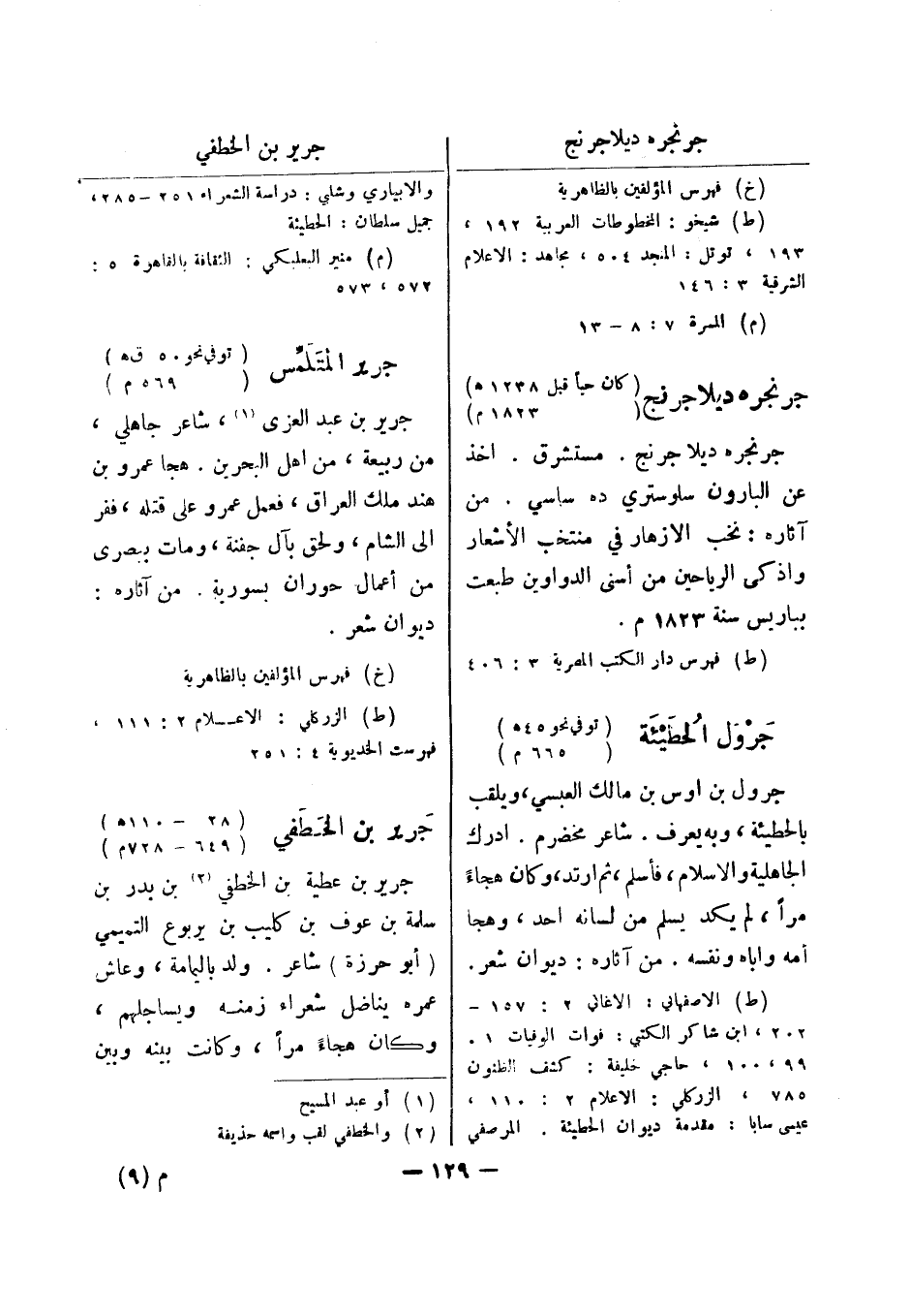(خ) فهرس المؤلفين بالظاهرية (ط) الزركلي: الاعلام 2: 111، فهرست الخديوية 4: 251 جرير بن الخطفي (28 - 110 هـ) (649 - 728 م) جرير بن عطية بن الخطفي (2) بن بدر بن سلمة بن عوف بن كليب بن يربوع التميمي (أبوحرزة) شاعر.