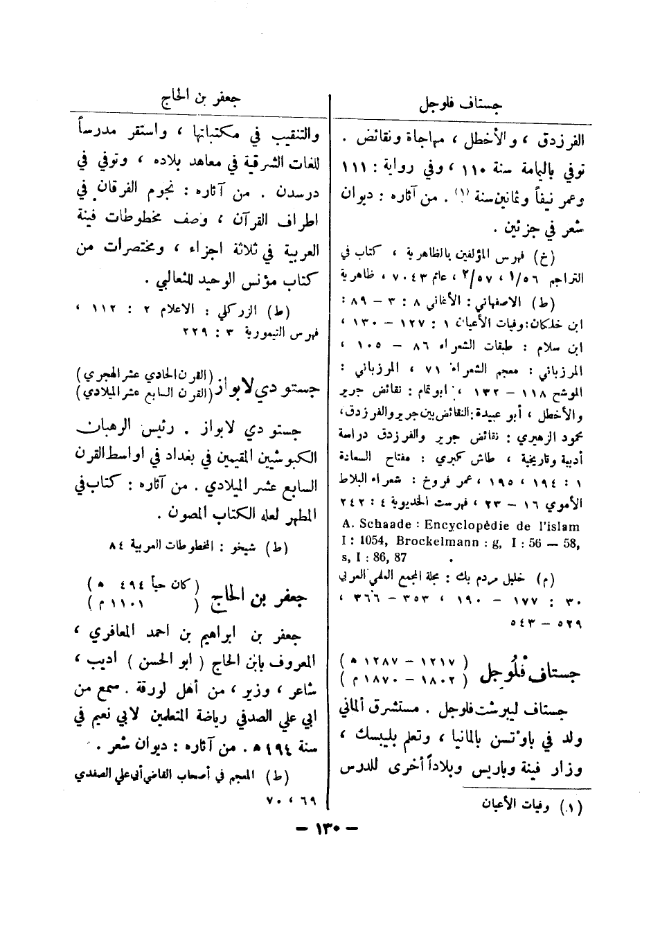 Schaade: Encyclopedie de l ' islam , 58 - 56: I: 4501 , Brockelmann: g , I 87 , 86: s , I (م) خليل مردم بك: مجلة المجمع العلمي العربي 30: 177 - 190، 353 - 366، 529 - 543 جستاف فلوجل (1217 - 1287 هـ) (1802 - 1870 م) جستاف ليبرشت فلوجل.