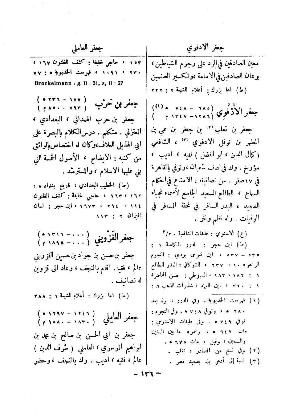 (ط) الخطيب البغدادي: تاريخ بغداد 7: 162، 163، حاجي خليفة: كشف الظنون 114، 214، 1673، ابن حجر: لسان الميزان 2: 113 جعفر القزويني (000 - 1316 هـ) (000 - 1898 م) جعفر بن حسن بن جواد بن حسين القزويني عالم، فقيه.