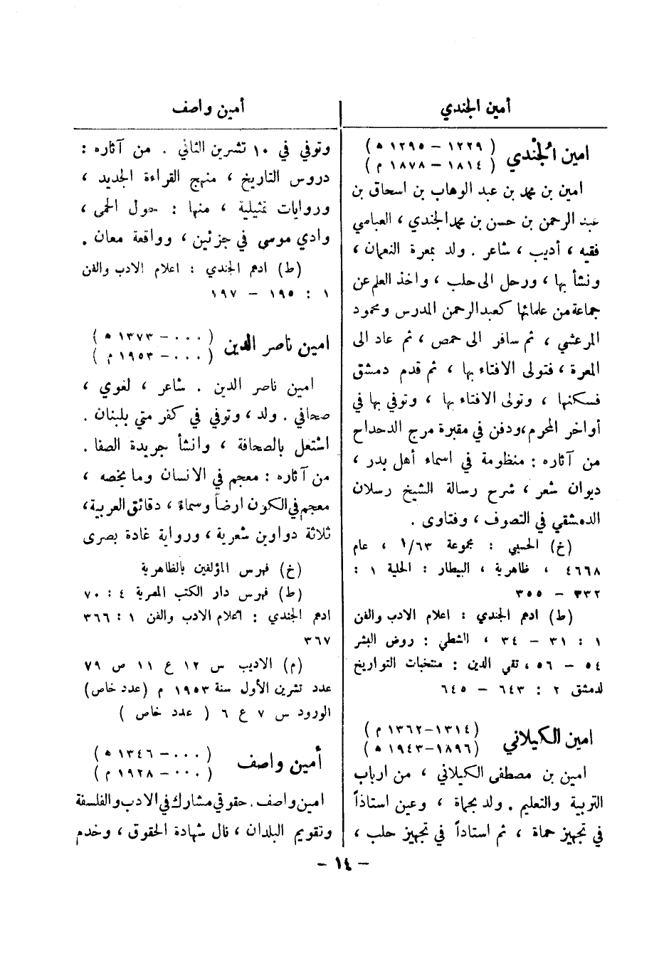 (ط) ادهم الجندي: اعلام الادب والفن 1: 195 - 197 امين ناصر الدين (000 - 1373 هـ) (000 - 1953 م) امين ناصر الدين.
