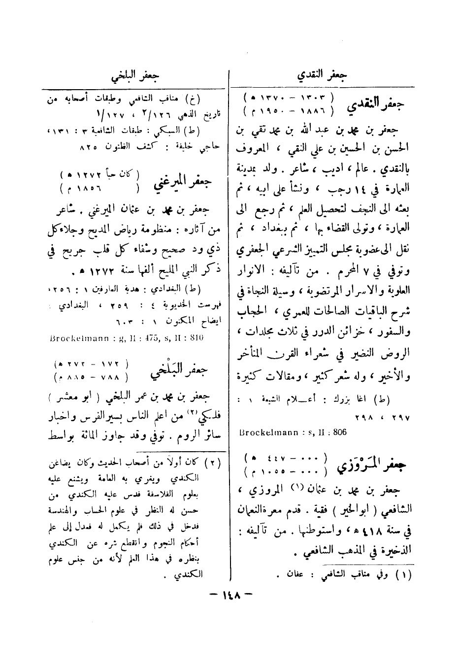 (ط) البغدادي: هدية العارفين 1: 256، فهرست الخديوية 4: 259، البغدادي: ايضاح المكنون 1: 603 810: Brockelmann: g , II: 574 , s , II جعفر البلخي (172 - 272 هـ) (788 - 885 م) جعفر بن محمد بن عمر البلخي (أبو معشر) فلكي (2) من اعلم الناس بسير الفرس واخبار سائر الروم.