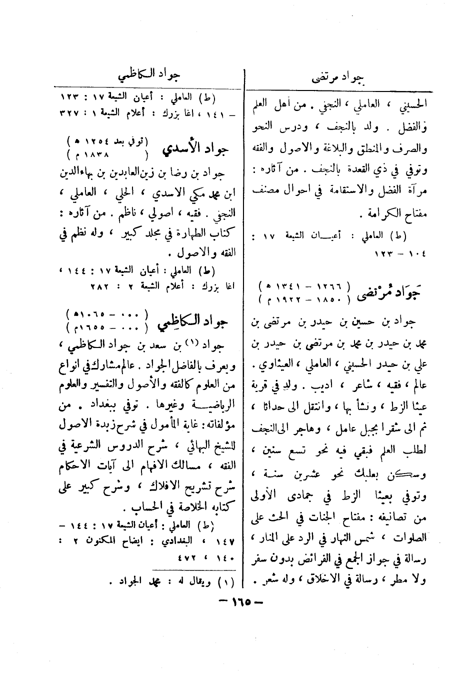 (ط) العاملي: أعيان الشيعة 17: 123 - 141، اغابزرك: أعلام الشيعة 1: 327 جواد الاسدي (توفي بعد 1254 هـ) (1838 م) جواد بن رضا بن زين العابدين بن بهاء الدين ابن محمد مكي الاسدي، الحلي، العاملي، النجفي.