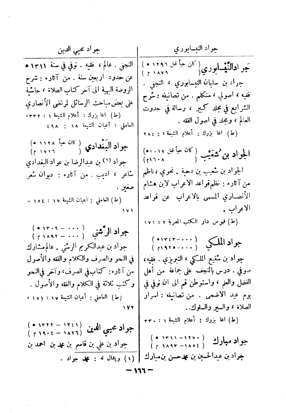 (ط) اغا بزرك: أعلام الشيعة 1: 330 جواد مبارك (1270 - 1311 هـ) (1854 - 1893 م) جواد بن عبد الحسين بن محمد حسن بن مبارك النجفي.