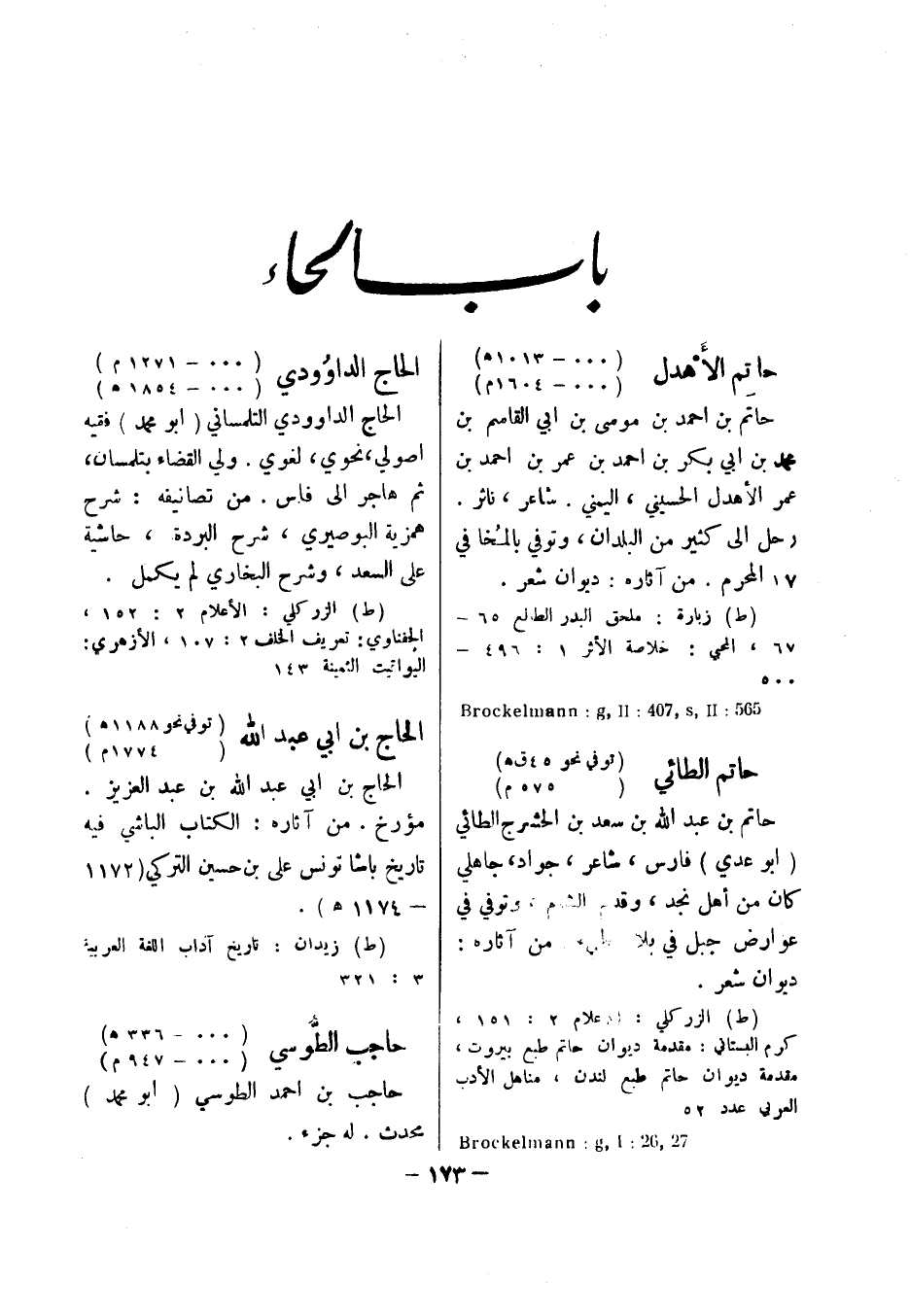 (ط) الزركلي: الاعلام 2: 151، كرم البستاني: مقدمة ديوان حاتم طبع بيروت، مقدمة ديوان حاتم طبع لندن، مناهل الادب العربي عدد 52 27 , 26: Brockelmann: g , I الحاج الداوودي (000 - 1271 هـ) (000 - 1854 م) الحاج الداوودي التلمساني (أبو محمد) فقيه اصولي، نحوي، لغوي.