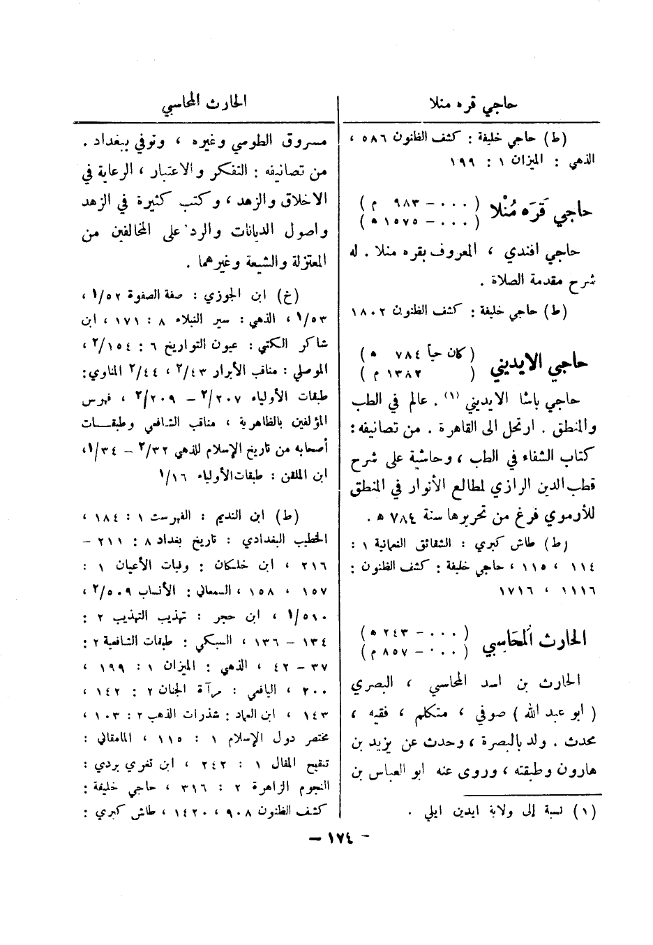 (ط) طاش كبري: الشقائق النعمانية 1: 114، 115، حاجي خليفة: كشف الظنون: 1116، 1716 الحارث المحاسبي (000 - 243 هـ) (000 - 857 م) الحارث بن اسد المحاسبي، البصري (أبو عبد الله) صوفي، متكلم، فقيه، محدث.