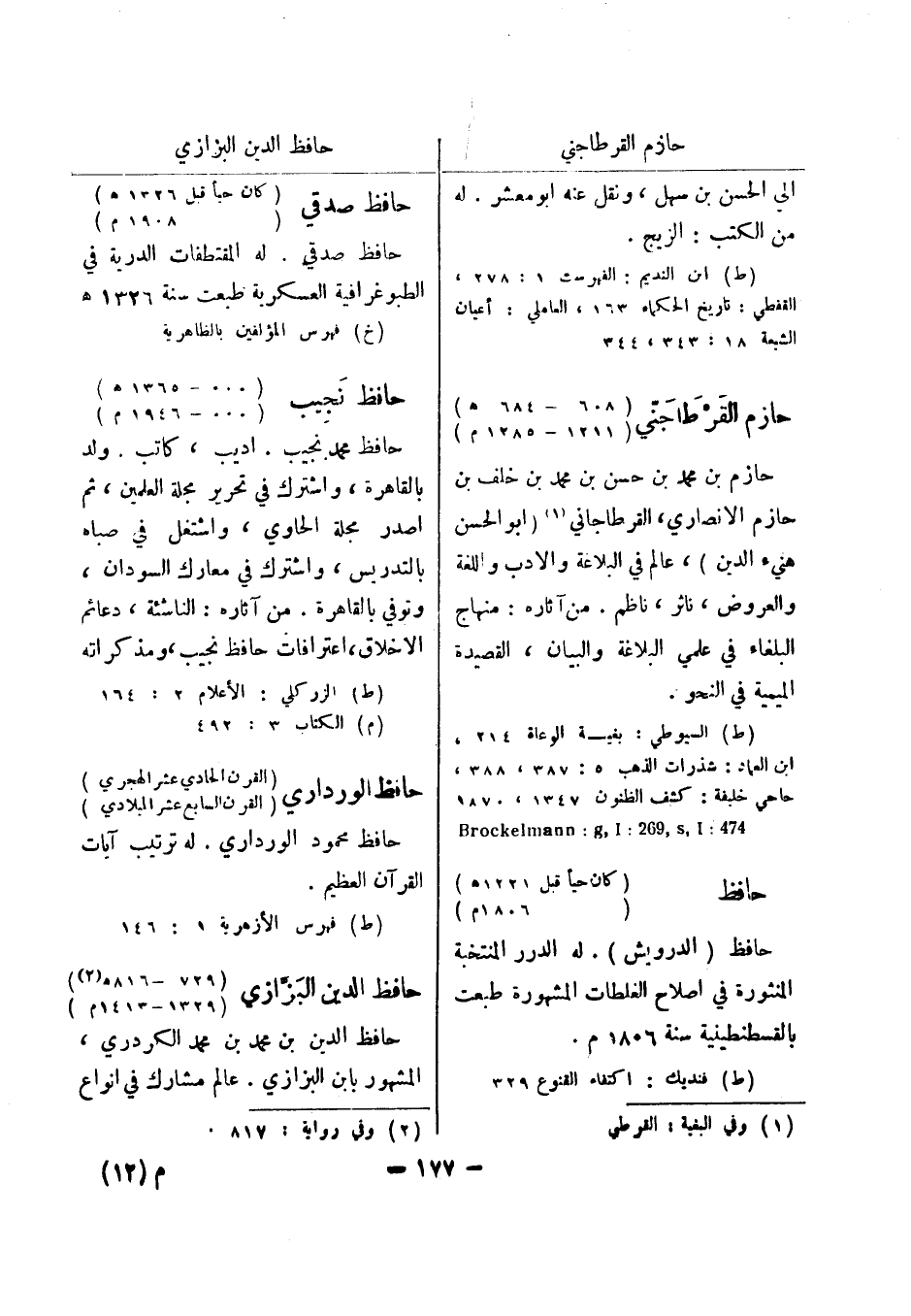 (ط) السيوطي: بغية الوعاة 214، ابن العماد: شذرات الذهب 5: 387، 388، حاجي خليفة: كشف الظنون 1347، 1870 474: Brockelmann: g , I: 962 , s , I حافظ (كان حيا قبل 1221 هـ) (1806 م) حافظ (الدرويش) .