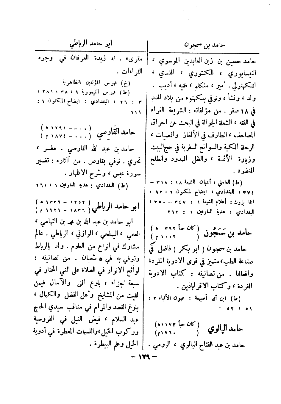 (ط) ابن أبي أصيبعة: عيون الانباء 2: 51، 52، حامد الپالوي (كان حيا 1173 هـ) (1760 م) حامد بن عبد الفتاح البالوي، الرومي.