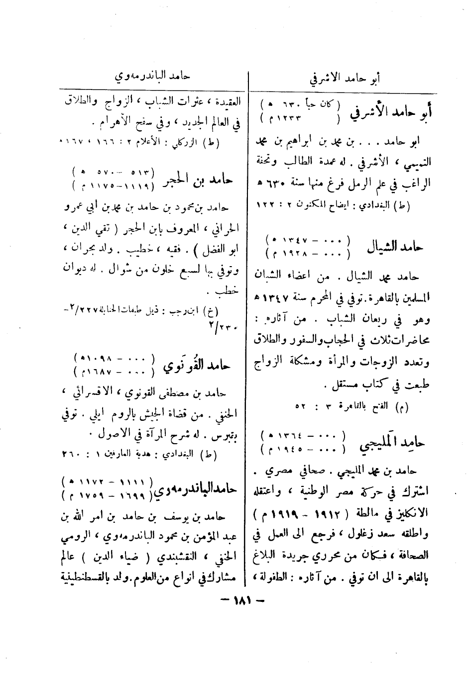 (ط) البغدادي: هدية العارفين 1: 260 حامد الياندرمه وي (1111 - 1172 هـ) (1699 - 1759 م) حامد بن يوسف بن حامد بن امر الله بن عبد المؤمن بن محمود الباندرمه وي، الرومي الحنفي، النقشبندي (ضياء الدين) عالم مشارك في انواع من العلوم.
