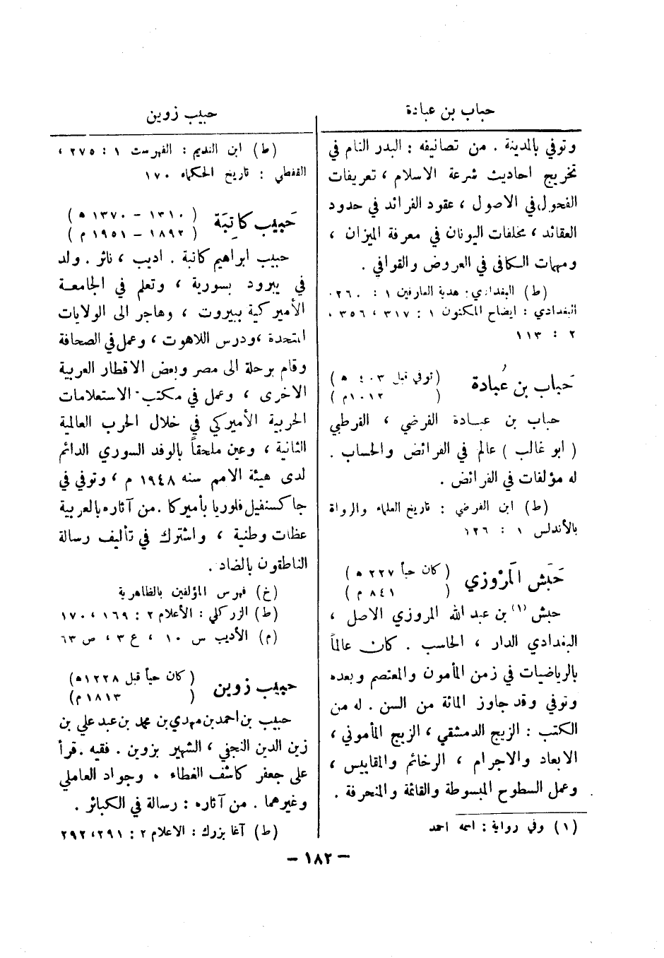 (ط) البغدادي: هدية العارفين 1: 260، البغدادي: ايضاح المكنون 1: 317، 356، 2: 113 حباب بن عبادة (توفي قبل 403 هـ) (1012 م) حباب بن عبادة الفرضي، القرطبي