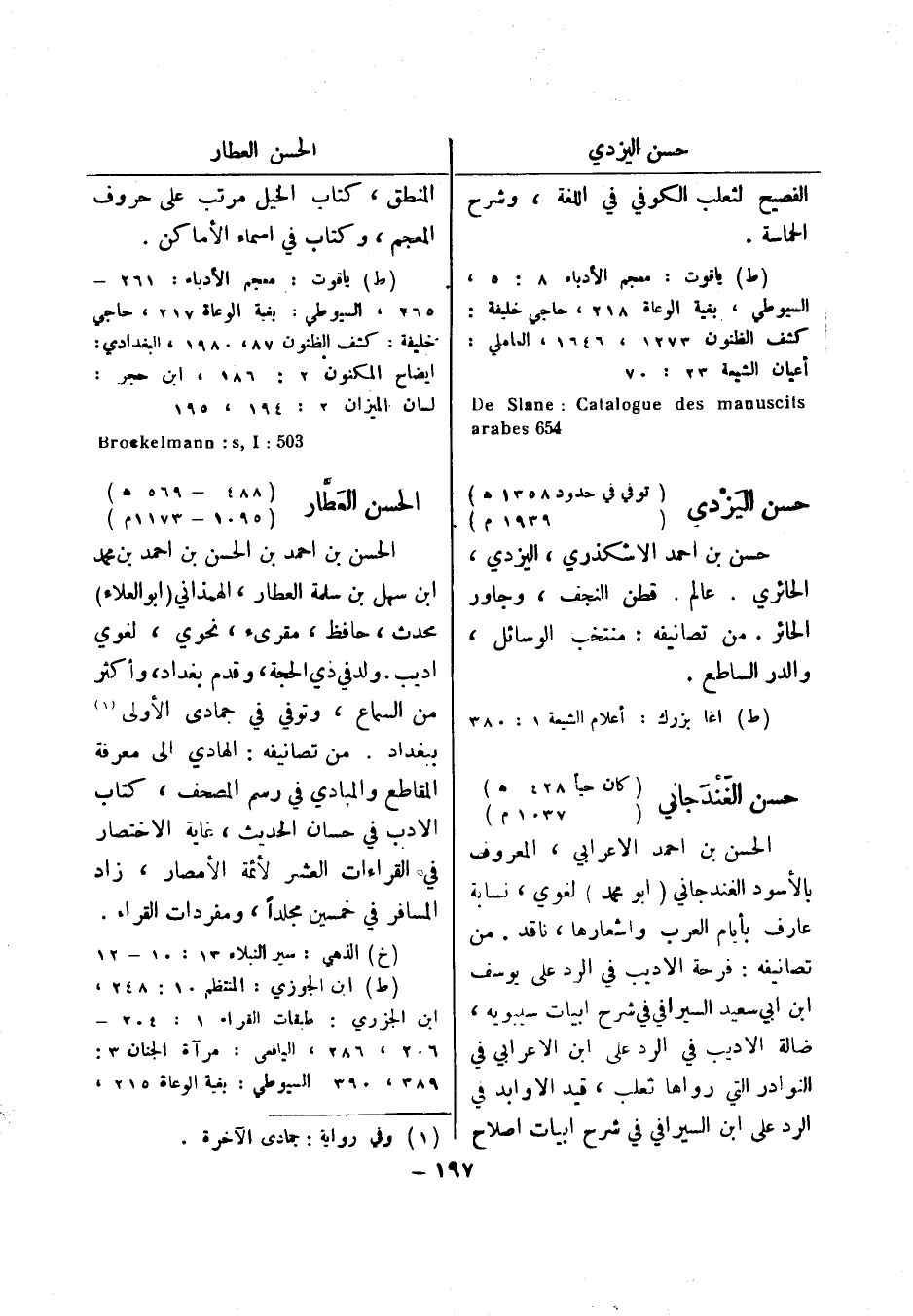 (ط) ياقوت: معجم الادباء 8: 5، السيوطي، بغية الوعاة 218، حاجي خليفة: كشف الظنون 1273، 1646، العاملي: أعيان الشيعة 23: 70 De Slane: Catalogue des manuscits 654 arabes حسن اليزدي (توفي في حدود 1358 هـ) (1939 م) حسن بن احمد الاشكذري، اليزدي، الحائري.