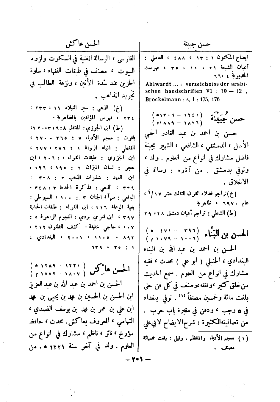 (خ) تراجم فضلاء القرن الثالث عشر 17 / 1، عام 6970، ظاهرية (ط) الشطي: تراجم أعيان دمشق 28، 29 الحسن بن البناء (396 - 471 هـ) (1006 - 1079 م) الحسن بن احمد بن عبد الله بن البناء البغدادي، الحنبلي (أبو علي) محدث، فقيه مشارك في انواع من العلوم.