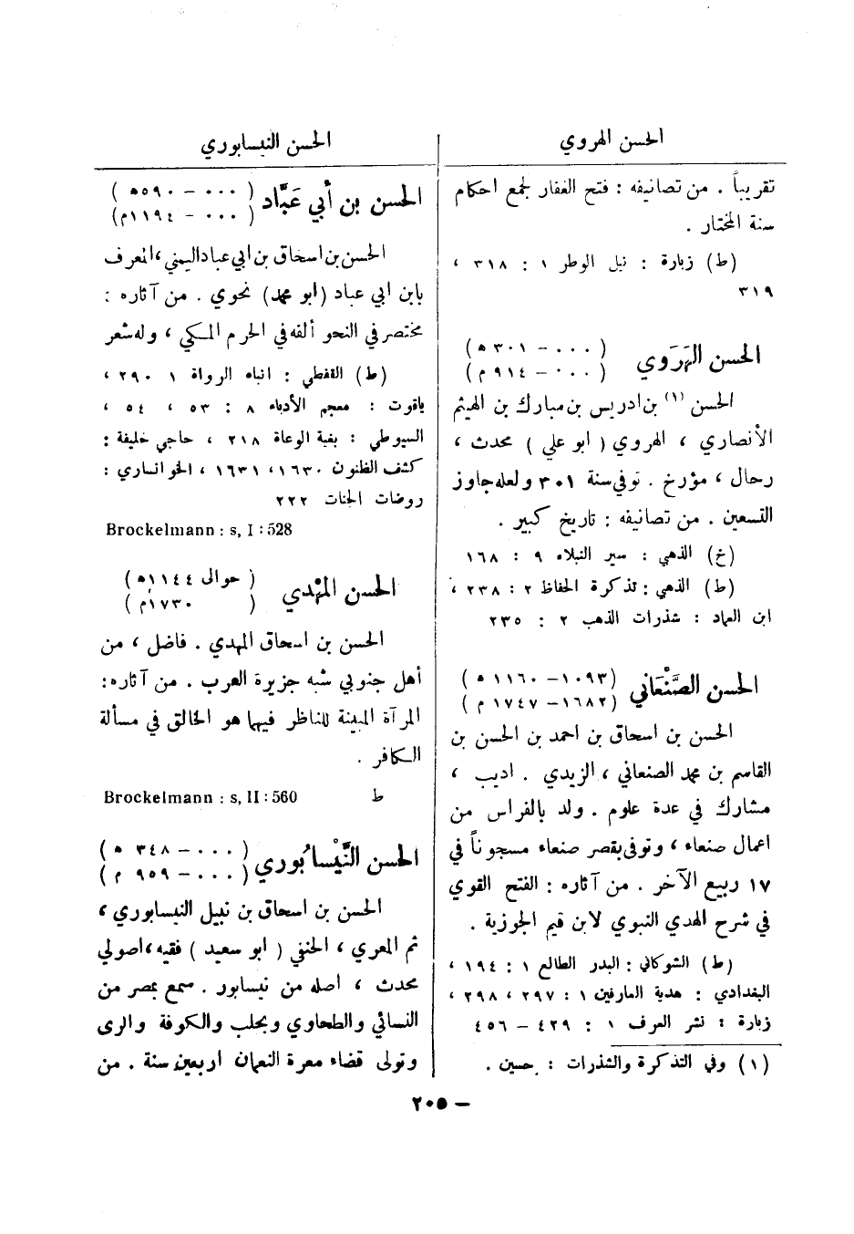 ط 560: Brockelmann: s , II الحسن النيسابوري (000 - 348 هـ) (000 - 959 م) الحسن بن اسحاق بن نبيل النيسابوري، ثم المعري، الحنفي (أبو سعيد) فقيه، اصولي محدث، اصله من نيسابور.