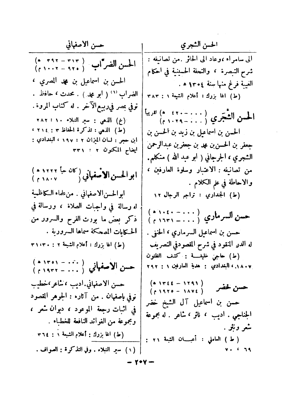 (ط) اغابزرك: أعلام الشيعة 1: 383 الحسن الشجري (000 - 420 هـ) تقريبا (000 - 1029 م) الحسن بن اسماعيل بن زيد بن الحسن بن جعفر بن الحسن بن محمد بن جعفر بن عبد الرحمن الشجري، الجرجاني (أبو عبد الله) متكلم.