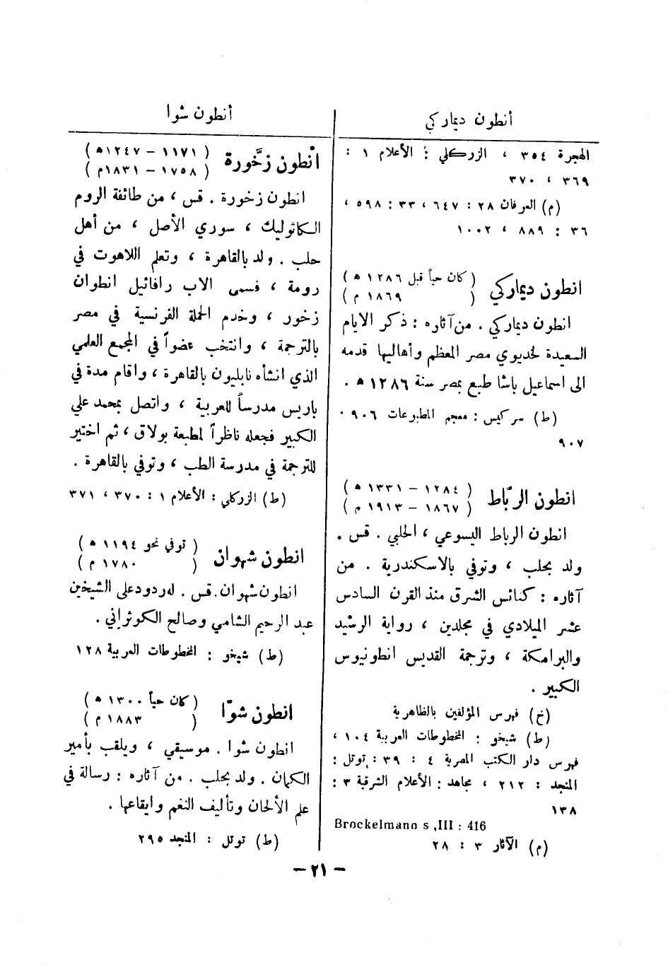 416: Brockelmann s , III (م) الآثار 3: 28 انطون زخورة (1171 - 1247 هـ) (1758 - 1831 م) انطون زخورة.