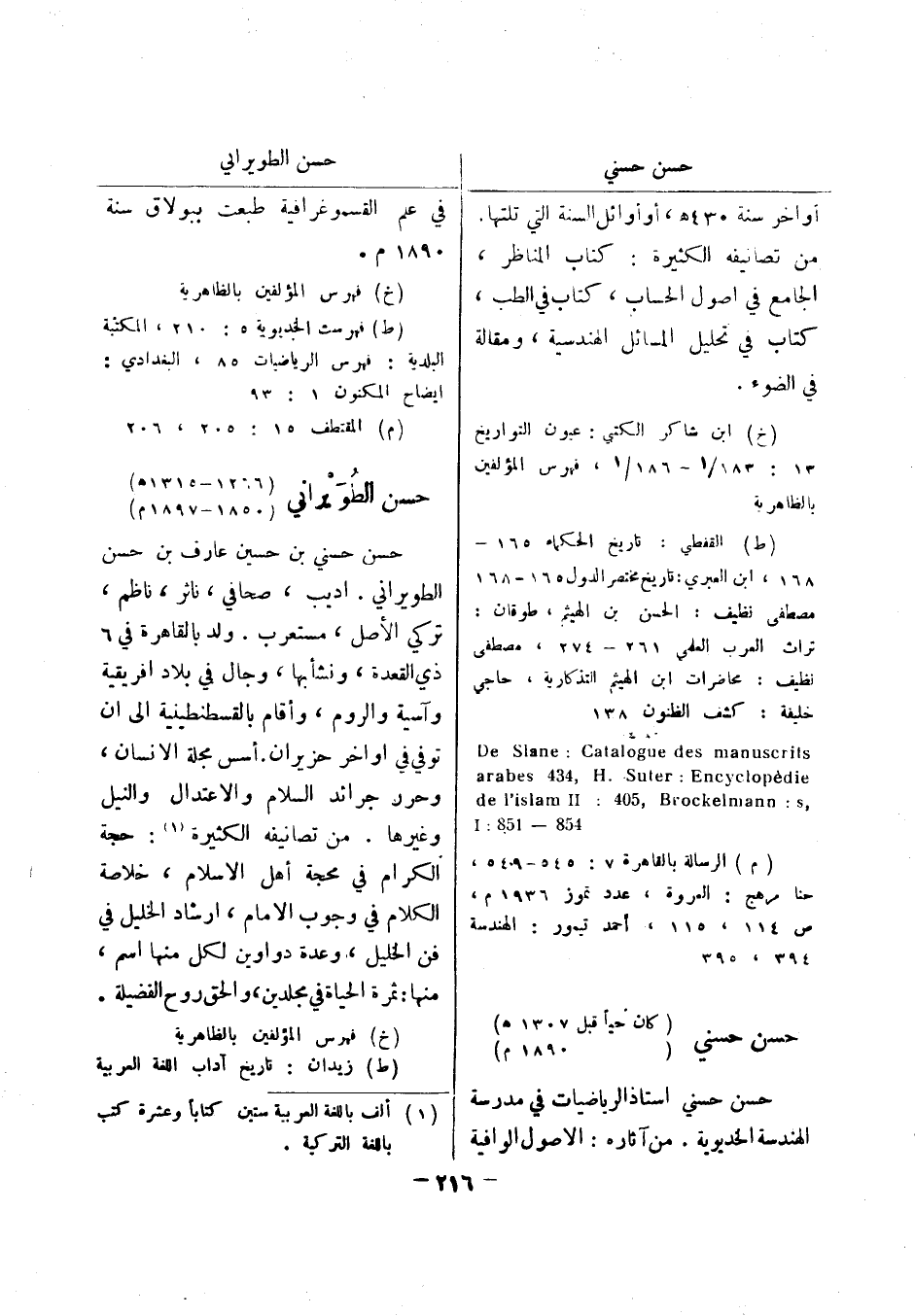 (خ) فهرس المؤلفين بالظاهرية (ط) فهرست الخديوية 5: 210، المكتبة البلدية: فهرس الرياضيات 85، البغدادي: ايضاح المكنون 1: 93 (م) المقتطف 15: 205، 206 حسن الطويراني (1266 - 1315 هـ) (1850 - 1897 م) حسن حسني بن حسين عارف بن حسن الطويراني.