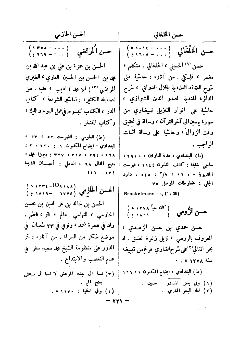 (ط) البغدادي: هدية العارفين 1: 291، حاجي خليفة: كشف الظنون 1144، فهرست الخديوية 2: 16، 7 / 2: 548: داود الجلبي؟: مخطوطات الموصل 75 391: Brockelmann: s , II حسن الرومي (كان حيا 1278 هـ) (1861 م) حسن حمدي بن حسن الزهدي، المعروف بالرومي، نزيل زغرة العتيق.