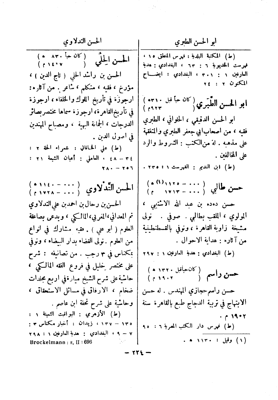 (ط) المكتبة البلدية: فهرس المنطق 15، فهرست الخديوية 6: 63، البغدادي: هدية العارفين 1: 301، البغدادي: ايضاح المكنون 2: 24 أبو الحسن الطبري (كان حيا قبل 310 هـ) (923 م) أبو الحسن الدقيقي، الحلواني، الطبري فقيه، من اصحاب ابي جعفر الطبري والمتفقهة على مذهبه.