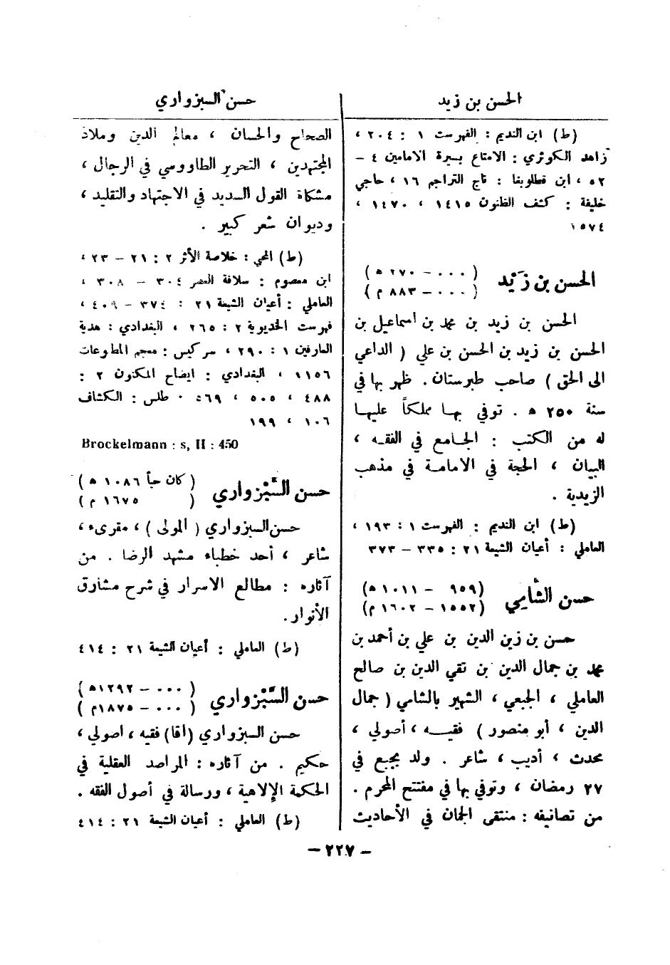 (ط) ابن النديم: الفهرست 1: 193، العاملي: أعيان الشيعة 21: 335 - 373 حسن الشامي (959 - 1011 هـ) (1552 - 1602 م) حسن بن زين الدين بن علي بن أحمد بن محمد بن جمال الدين بن تقي الدين بن صالح العاملي، الجبعي، الشهير بالشامي (جمال الدين، أبو منصور) فقيه، أصولي، محدث، أديب، شاعر.