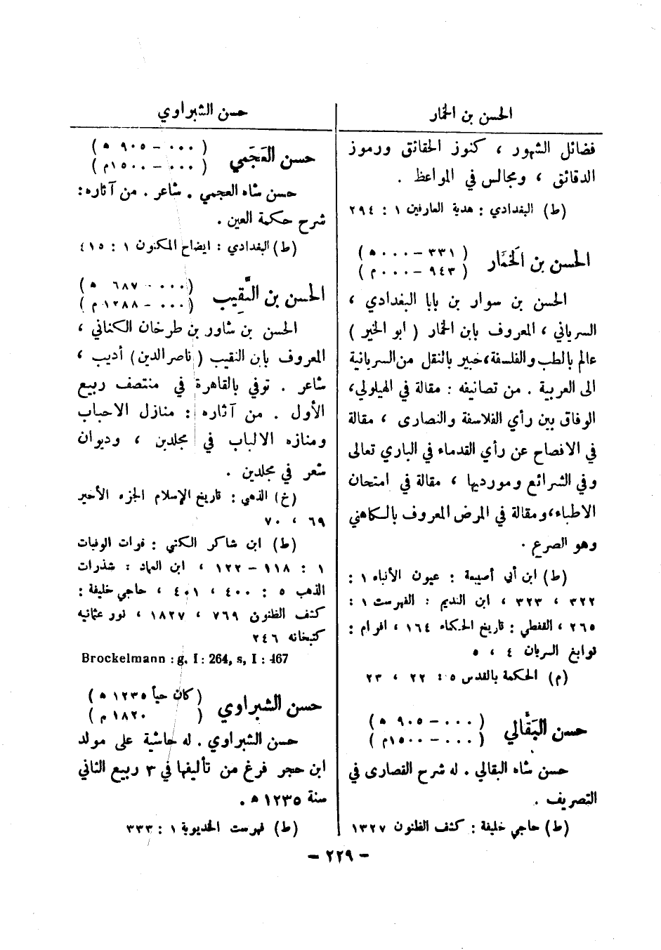 الذهب 5: 400، 401، حاجي خليفة: كشف الظنون 769، 1827، نور عثمانيه كتبخانه 246 467: Brockelmann g , I: 462 , s , I حسن الشبراوي (كان حيا 1235 هـ) (1820 م) حسن الشبراوي.