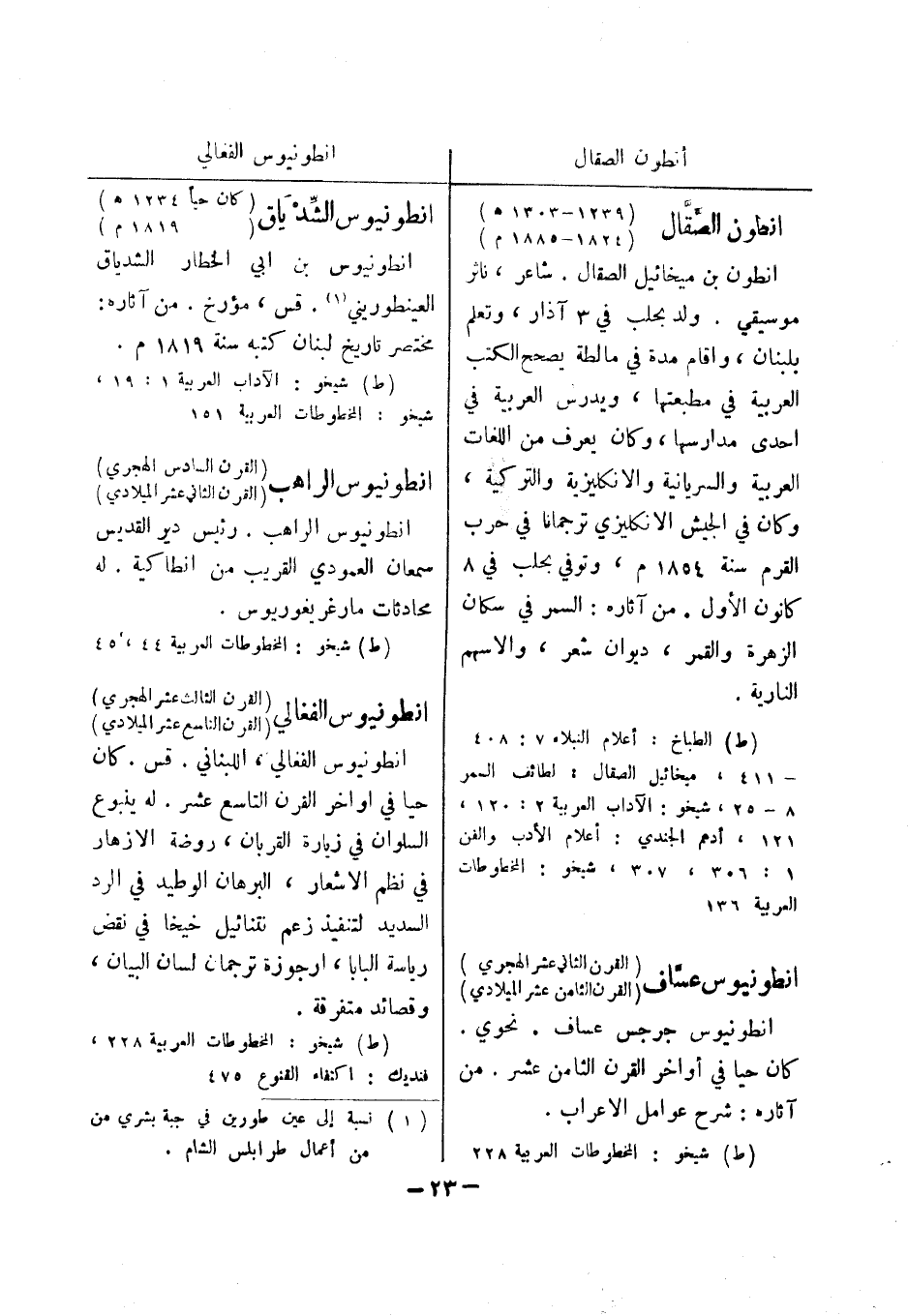 (ط) شيخو: المخطوطات العربية 44، 45 انطونيوس الفغالي القرن الثالث عشر الهجري) (القرن التاسع عشر الميلادي) انطونيوس الفغالي، اللبناني.