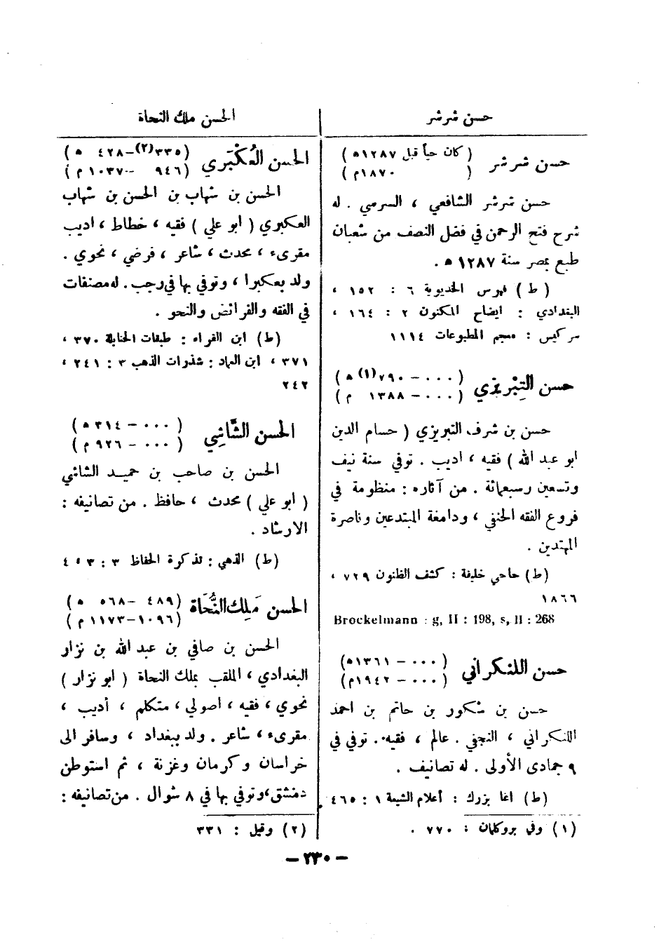 268: Brockelmann: g , II: 891 , s , II حسن اللنكراني (000 - 1361 هـ) (000 - 1942 م) حسن بن شكور بن حاتم بن احمد اللنكراني، النجفي.