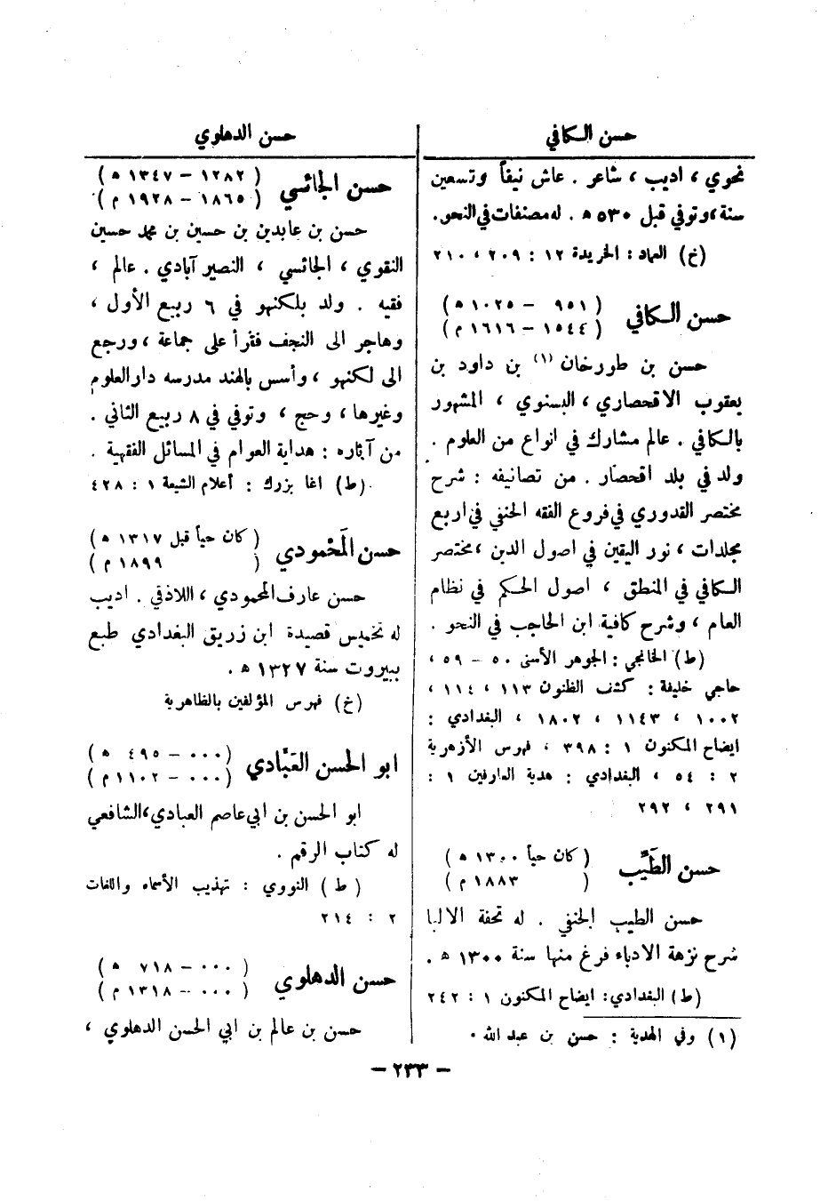 (خ) العماد: الخريدة 12: 209، 210 حسن الكافي (951 - 1025 هـ) (1544 - 1616 م) حسن بن طورخان (1) بن داود بن يعقوب الاقحصاري، البسنوي، المشهور بالكافي.