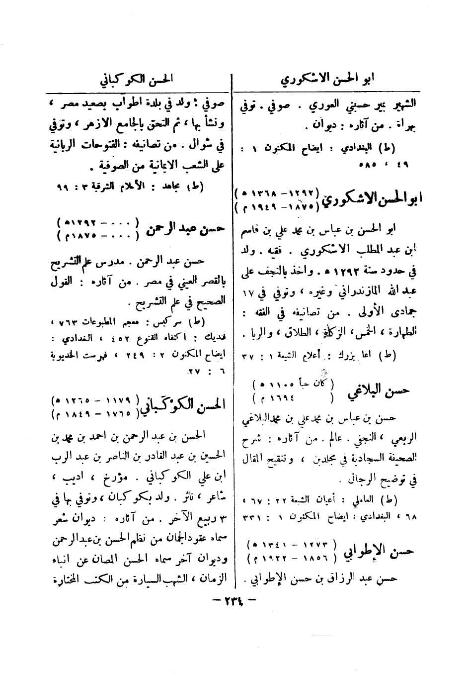 (ط) العاملي: أعيان الشيعة 22: 67، 68، البغدادي ايضاح المكنون 1: 331 حسن الاطوابي (1273 - 1341 هـ) (1856 - 1922 م) حسن عبد الرزاق بن حسن الاطوابي.