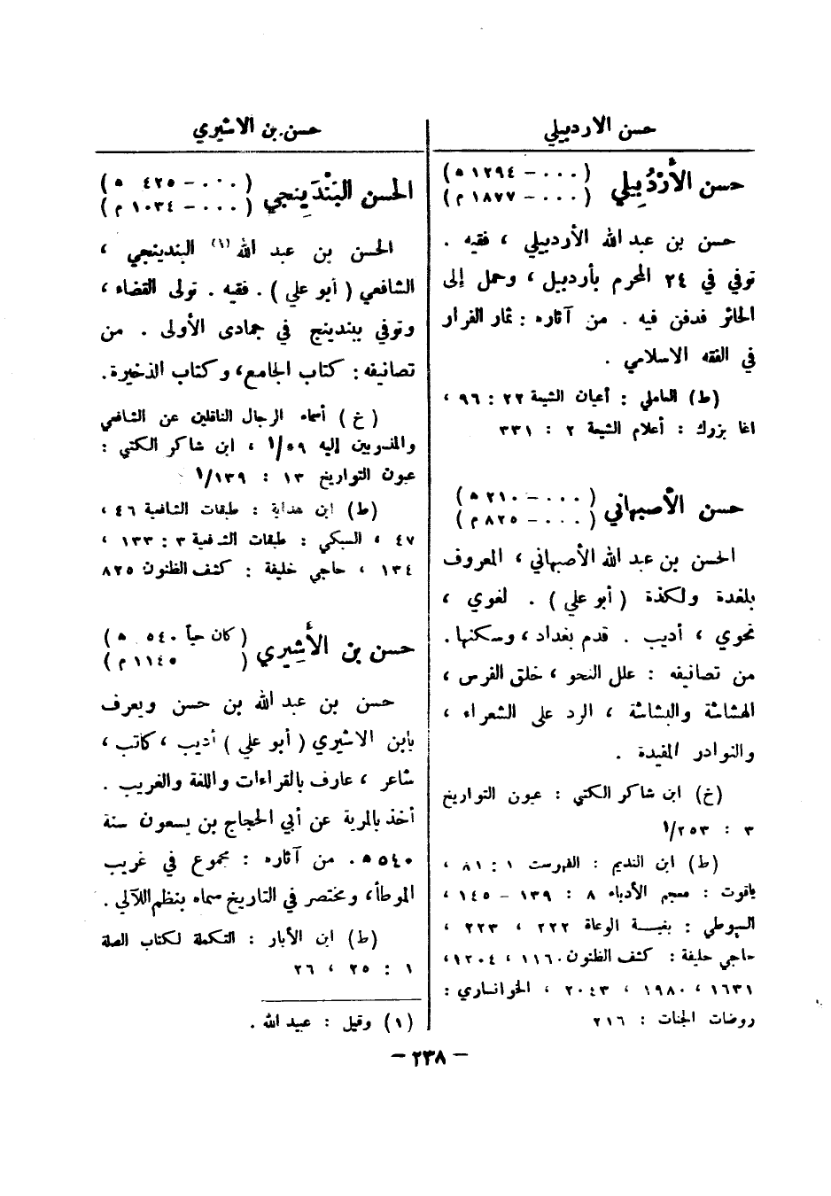 (ط) العاملي: أعيان الشيعة 22: 96، اغا بزرك: أعلام الشيعة 2: 331 حسن الاصبهاني (000 - 210 هـ) (000 - 825 م) الحسن بن عبد الله الاصبهاني، المعروف بلغدة ولكذة (أبو علي) .
