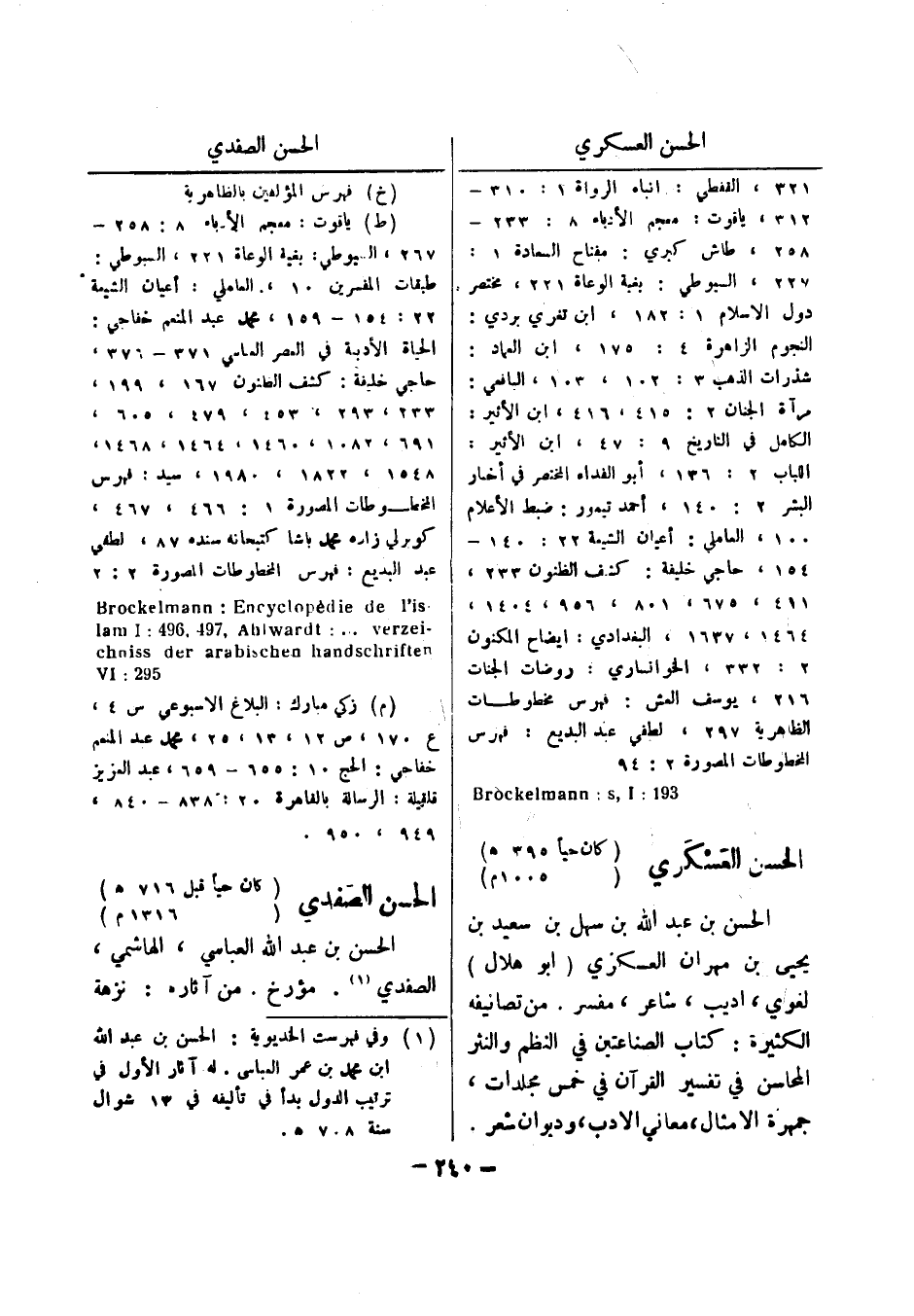 دول الاسلام 1: 182، ابن تغري بردي: النجوم الزاهرة 4: 175، ابن العماد: شذرات الذهب 3: 102، 103، اليافعي: مرآة الجنان 2: 415، 416، ابن الاثير: الكامل في التاريخ 9: 47، ابن الاثير: اللباب 2: 136، أبو الفداء المختصر في أخبار البشر 2: 140، أحمد تيمور: ضبط الاعلام 100، العاملي: أعيان الشيعة 22: 140 - 154، حاجي خليفة: كشف الظنون 233، 411، 675، 801، 956، 1404، 1464، 1637، البغدادي: ايضاح المكنون 2: 332، الخوانساري: روضات الجنات 216، يوسف العش: فهرس مخطوطات الظاهرية 297، لطفي عبد البديع: فهرس المخطوطات المصورة 2: 94 193: Brockelmann s , I الحسن العسكري (كان حيا 395 هـ) (1005 م) الحسن بن عبد الله بن سهل بن سعيد بن يحيى بن مهران العسكري (أبو هلال) لغوي، اديب، شاعر، مفسر.