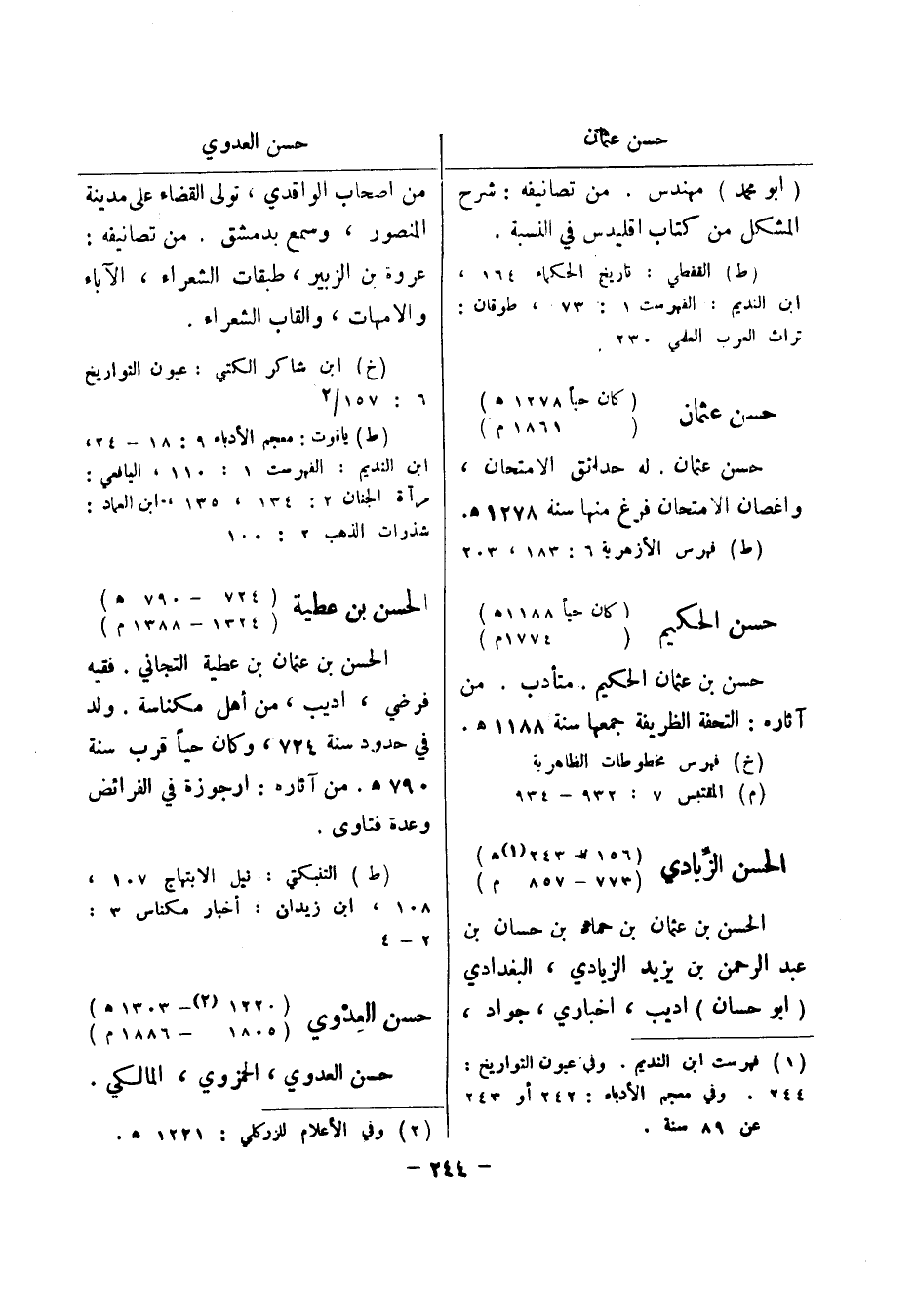 (خ) فهرس مخطوطات الظاهرية (م) المقتبس 7: 932 - 934 الحسن الزيادي (156 - 243 (1) هـ) (773 - 857 م) الحسن بن عثمان بن حماء؟ بن حسان بن عبد الرحمن بن يزيد الزيادي، البغدادي (أبو حسان) اديب، اخباري، جواد،