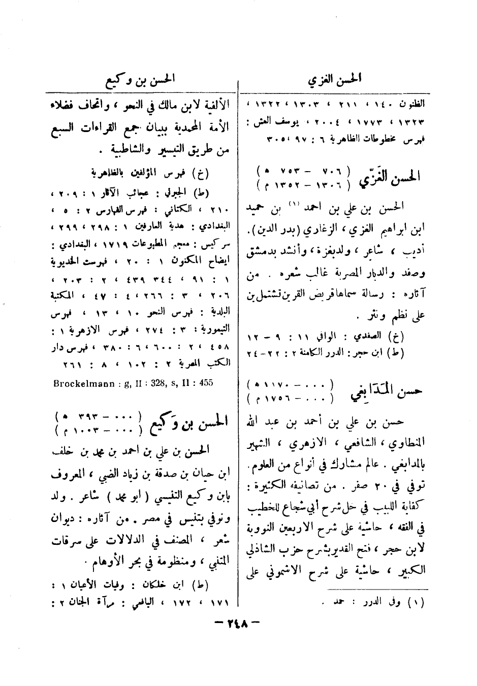 سركيس: معجم المطبوعات 1719، البغدادي: ايضاح المكنون 1: 20، فهرست الخديوية 1: 91، 344، 439، 2: 203، 206، 3: 266، 4: 47، المكتبة البلدية: فهرس النحو 10، 13، فهرس التيمورية: 3، 274، فهرس الازهرية 1: 458، 2: 600، 6: 380، فهرس دار الكتب المصرية 2: 102، 8: 261، 455: Brockelmann: g , II: 823 , s , II الحسن بن وكيع (000 - 393 هـ) (000 - 1003 م) الحسن بن علي بن احمد بن محمد بن خلف ابن حيان بن صدقة بن زياد الضبي، المعروف بابن وكيع التنيسي (أبو محمد) شاعر.