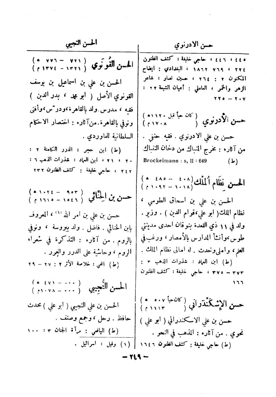 (ط) ابن حجر: الدرر الكامنة 2: 20، 21، ابن العماد: شذرات الذهب 6: 242، حاجي خليفة: كشف الظنون 232 حسن بن الحنائي (953 - 1024 هـ) (1546 - 1615 م) حسن بن علي بن امر الله (1) ، المعروف بابن الحنائي.