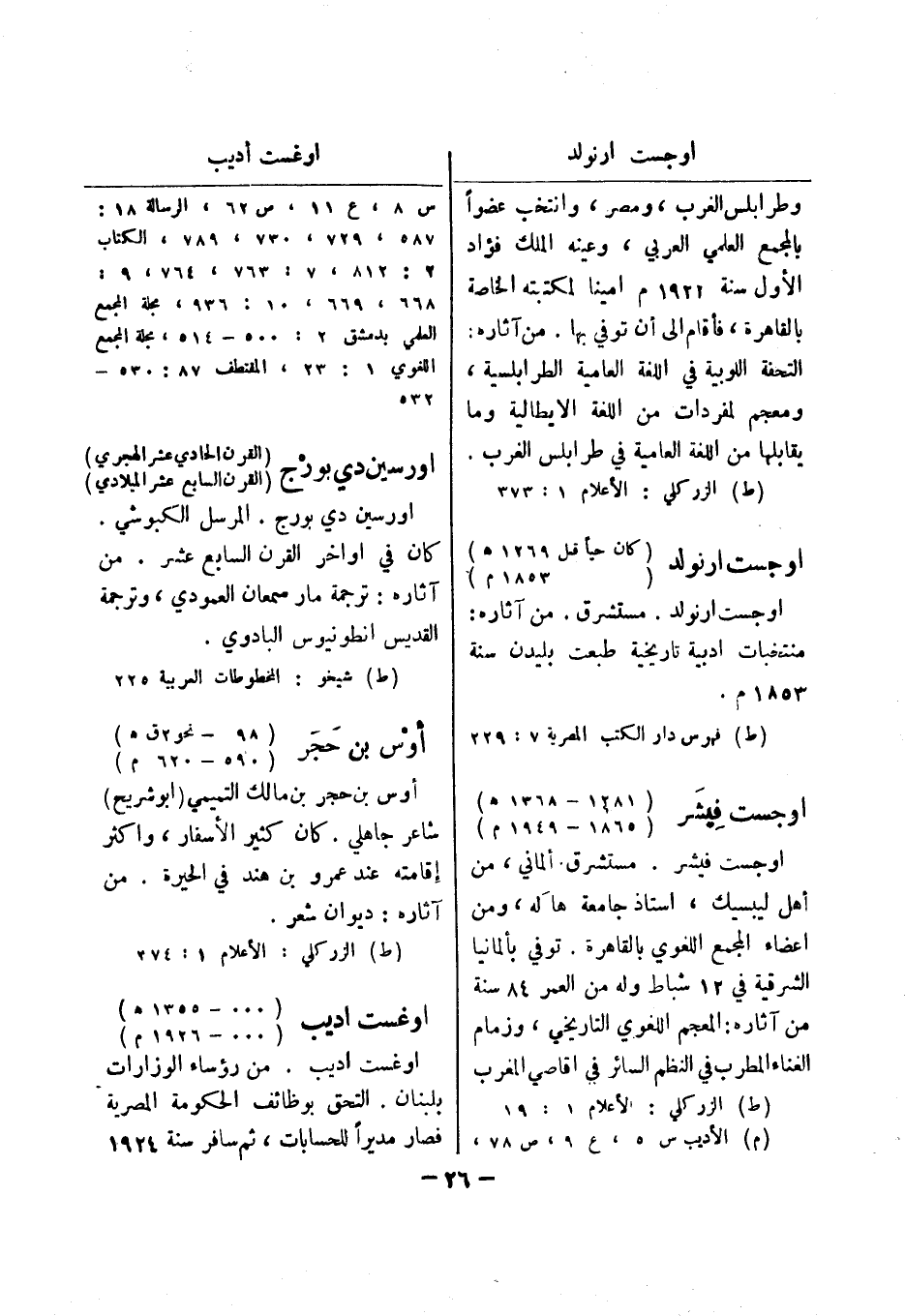 (ط) الزركلي: الاعلام 1: 274 اوغست اديب (000 - 1355 هـ) (000 - 1926 م) اوغست اديب.