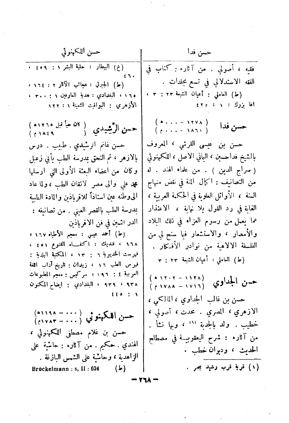 (ط) العاملي: أعيان الشيعة 23: 3 حسن الجداوي (1128 - 1202 هـ) (1716 - 1788 م) حسن بن غالب الجداوي، المالكي، الازهري، المصري.