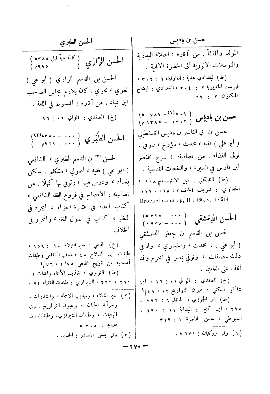 (خ) الصفدي: الوافي 11: 16 الحسن الطبري (000 - 350 هـ (2)) (000 - 961 م) الحسن (3) بن القاسم الطبري، الشافعي (أبو علي) فقيه، اصولي، متكلم.