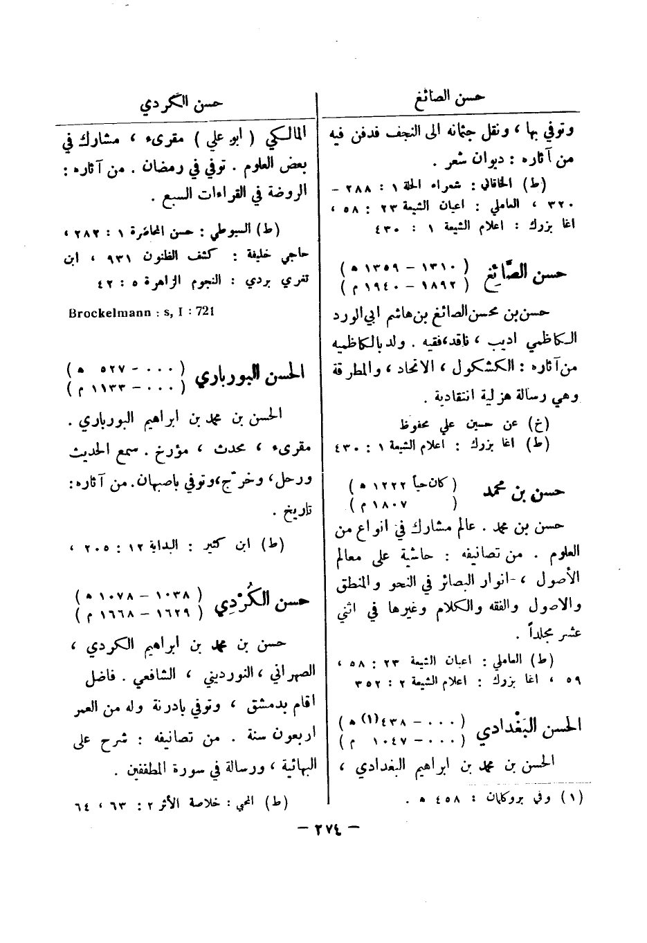 (ط) السيوطي: حسن المحاضرة 1: 282، حاجي خليفة: كشف الظنون 931، ابن تغري بردي: النجوم الزاهرة 5: 42 721: Brockelmann: s , I الحسن البورباري (000 - 527 هـ) (000 - 1133 م) الحسن بن محمد بن ابراهيم البورباري.