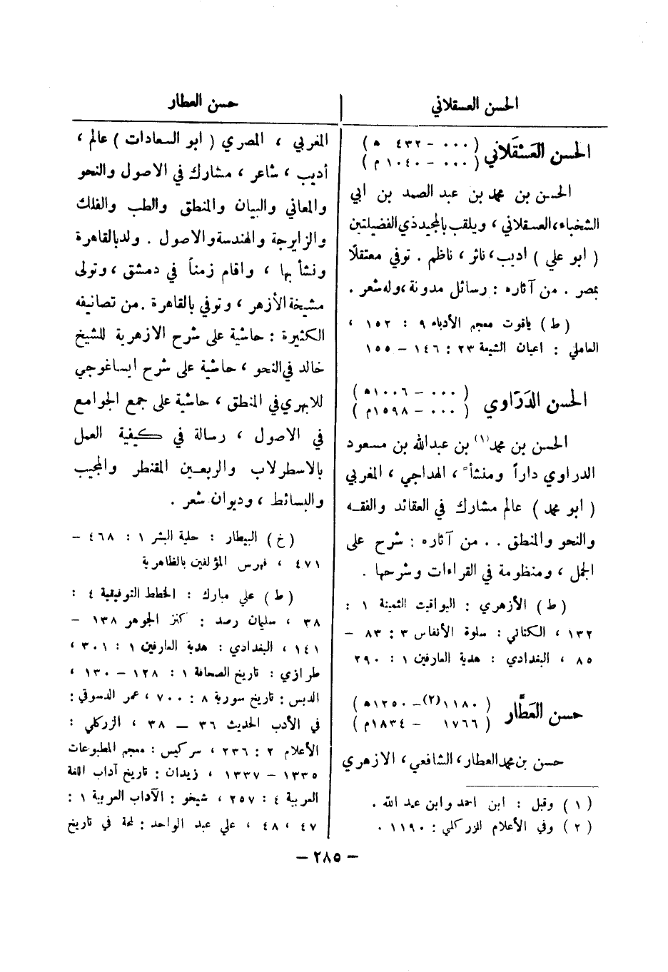 (ط) الازهري: اليواقيت الثمينة 1: 132، الكتاني: سلوة الانفاس 3: 83 - 85، البغدادي: هدية العارفين 1: 290 حسن العطار (1180 (2) - 1250 هـ) (1766 - 1834 م) حسن بن محمد العطار، الشافعي، الازهري