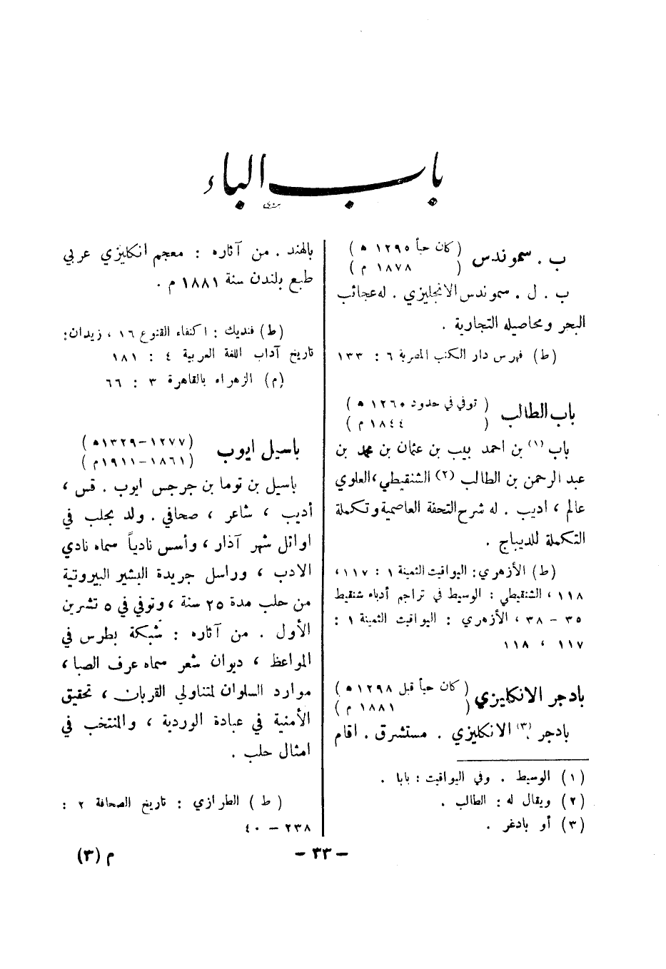 (ط) الازهري: اليواقيت الثمينة 1: 117، 118، الشنقيطي: الوسيط في تراجم أدباء شنقيط 35 - 38، الازهري: اليواقيت الثمينة 1: 117، 118 بادجر الانكليزي (كان حيا قبل 1298 هـ) (1881 م) بادجر، (3) الانكليزي.