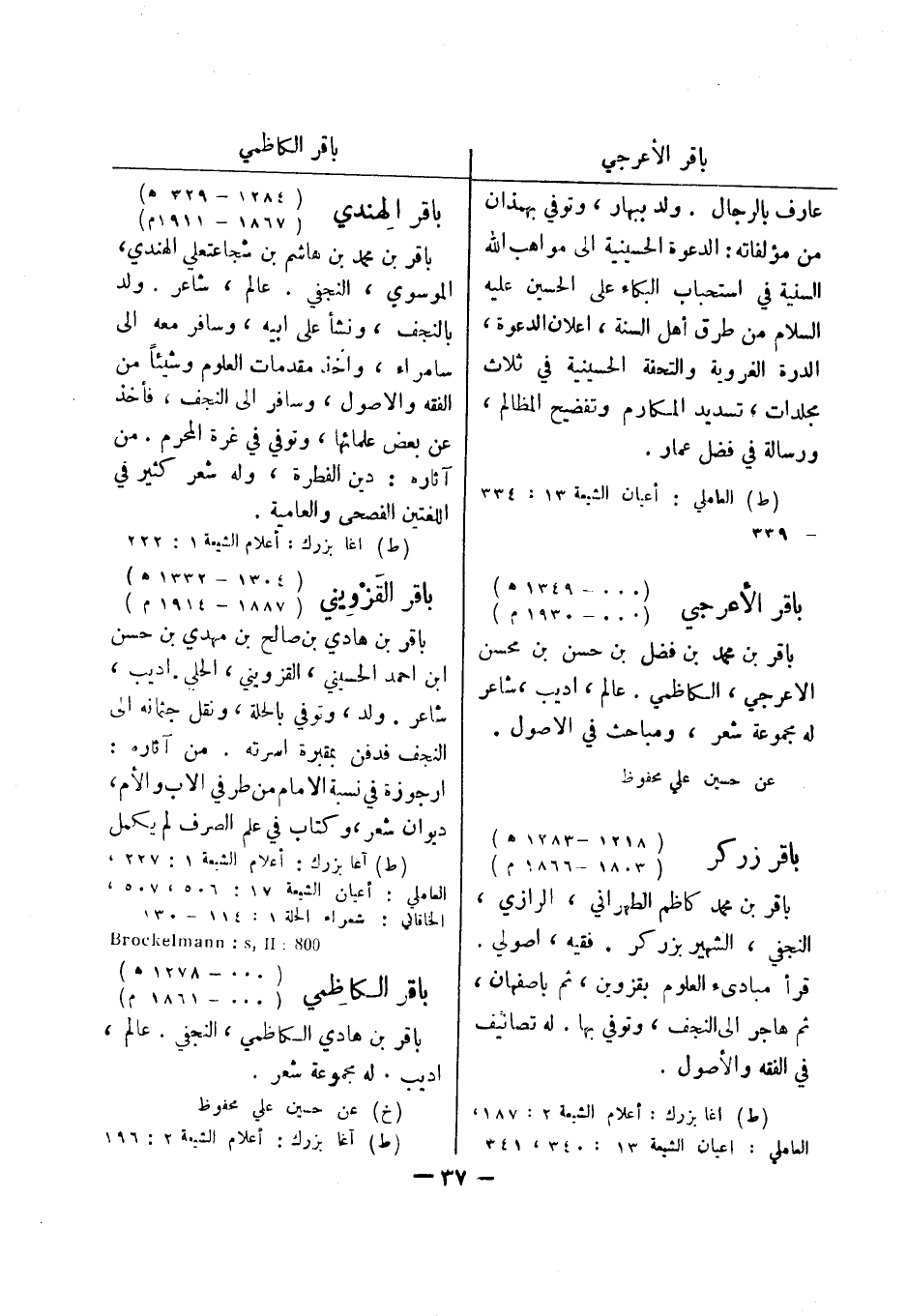 (ط) اغا بزرك: أعلام الشيعة 2: 187، العاملي: اعيان الشيعة 13: 340، 341 باقر الهندي (1284 - 329 هـ) (1867 - 1911 م) باقر بن محمد بن هاشم بن شجاعتعلي الهندي، الموسوي، النجفي.
