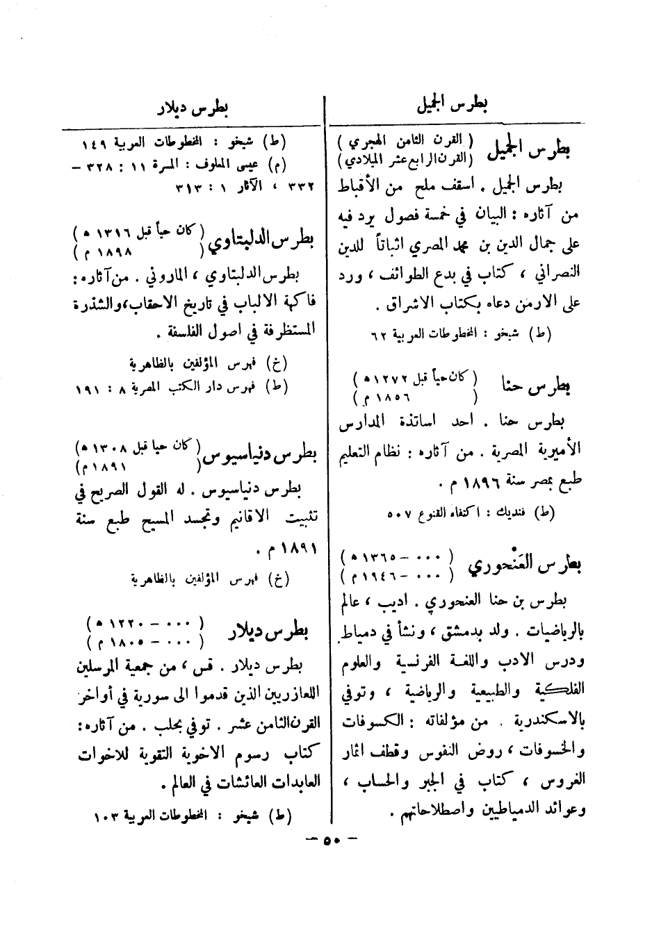 (خ) فهرس المؤلفين بالظاهرية بطرس ديلار (000 - 1220 هـ) (000 - 1805 م) بطرس ديلار.