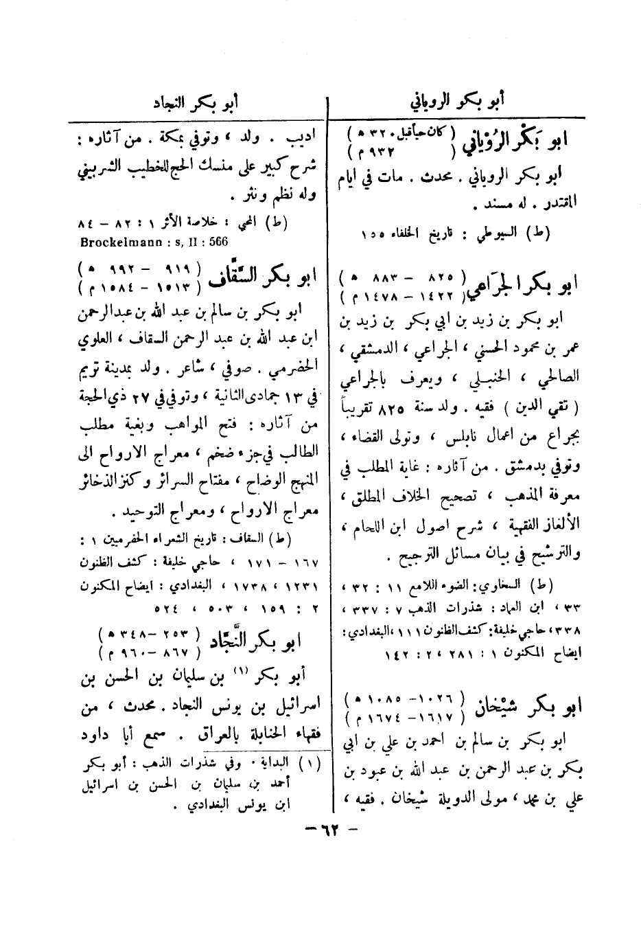 (ط) السخاوي: الضوء اللامع 11: 32، 33، ابن العماد: شذرات الذهب 7: 337، 338، حاجي خليفة: كشف الظنون 111، البغدادي: ايضاح المكنون 1: 281، 2: 142 أبو بكر شيخان (1085 1026 هـ) (1617 - 1674 م)