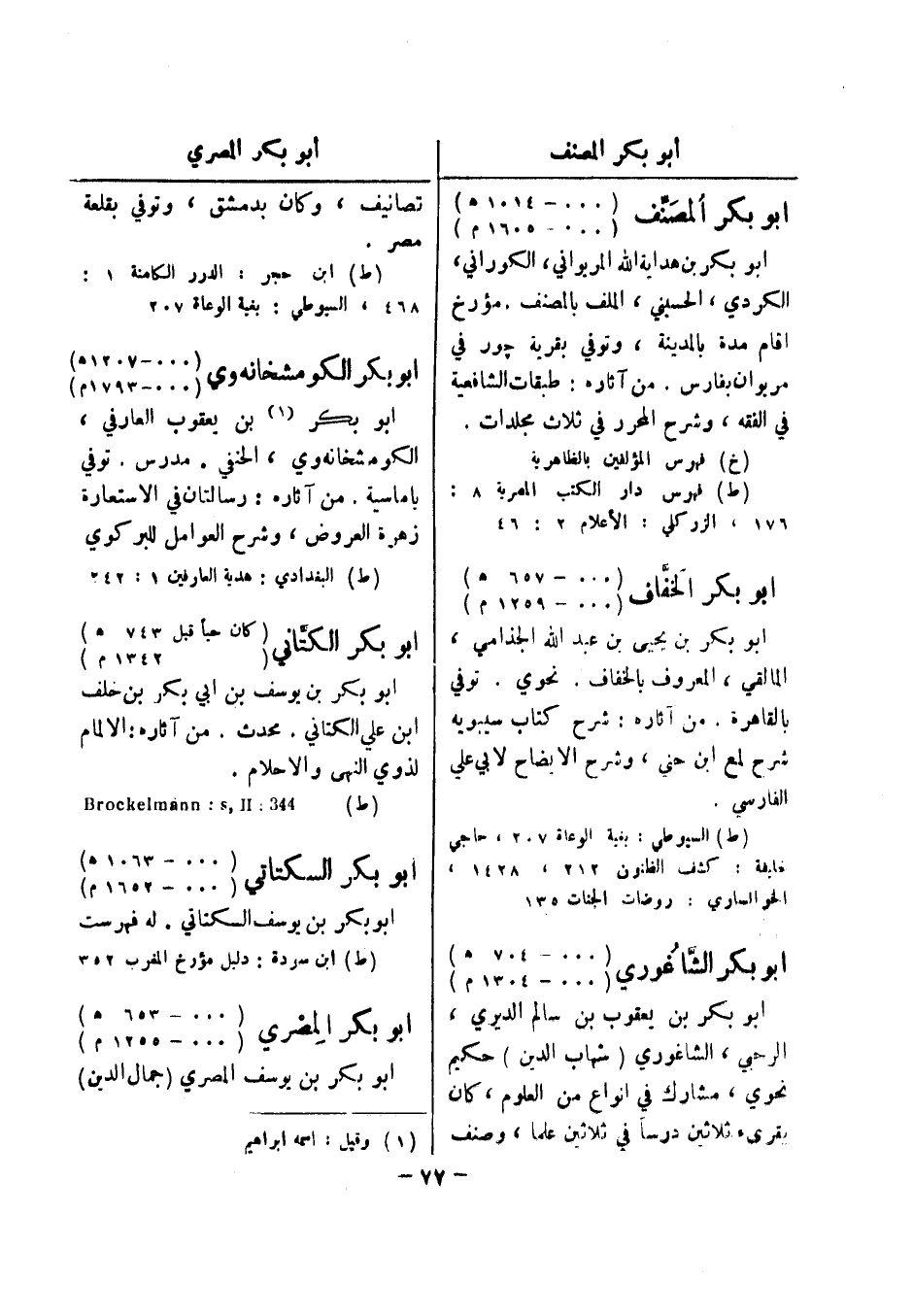 (ط) ابن حجر: الدرر الكامنة 1: 468، السيوطي: بغية الوعاة 207 أبو بكر الكومشخانه وي (000 - 1207 هـ) (000 - 1793 م) أبو بكر (1) بن يعقوب العارفي، الكومشخانه وي، الحنفي.