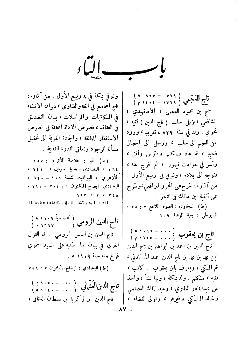 (ط) البغدادي: ايضاح المكنون 2: 251 تاج الدين العثماني (000 - 1050 هـ؟) (000 - 1640 م؟) تاج الدين بن زكريا بن سلطان العثماني،