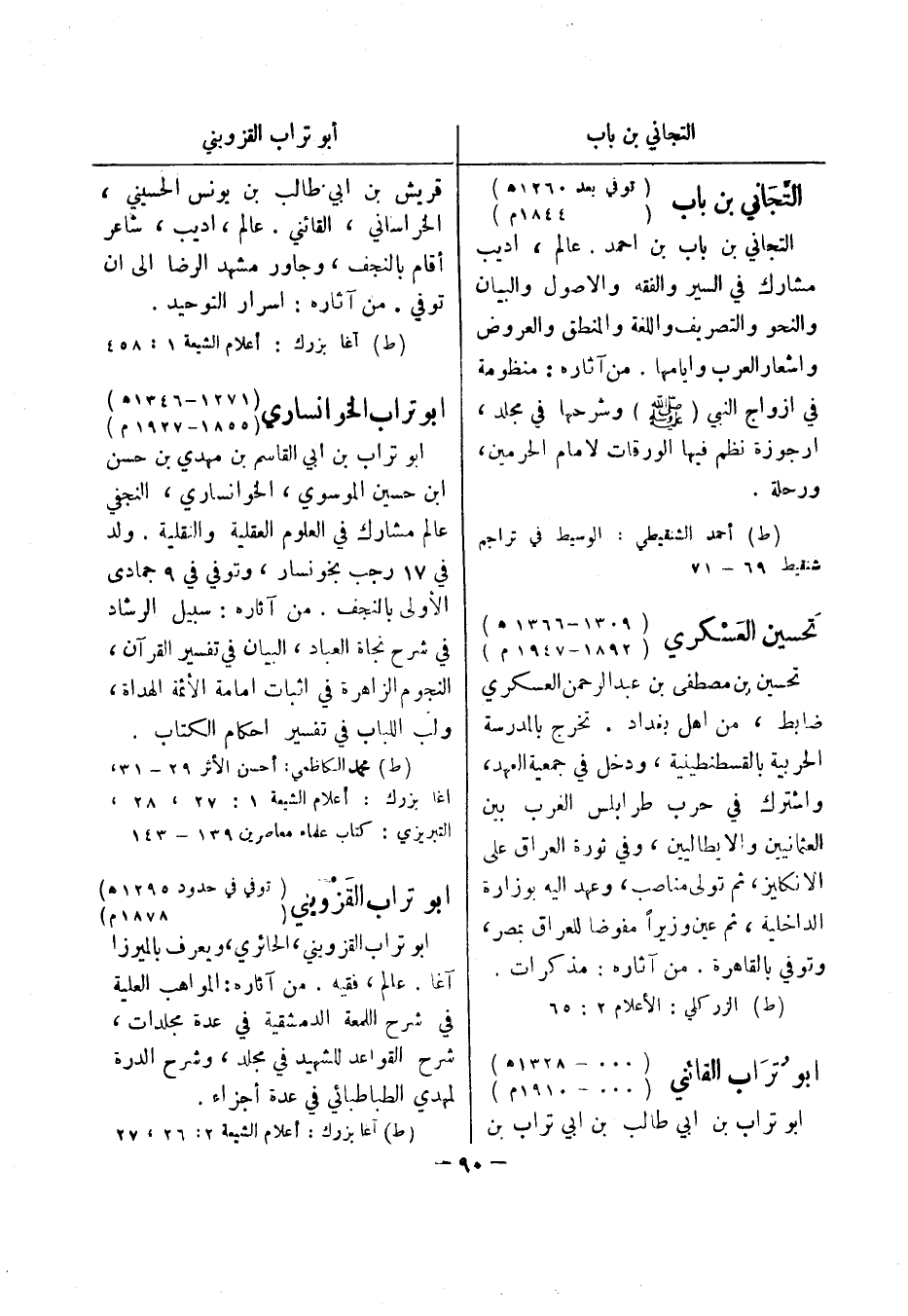 اغا بزرك: أعلام الشيعة 1: 27، 28، التبريزي: كتاب علماء معاصرين 143 139 أبو تراب القزويني (توفي في حدود 1295 هـ) (1878 م) أبو تراب القزويني، الحائري، ويعرف بالميرزا آغا.