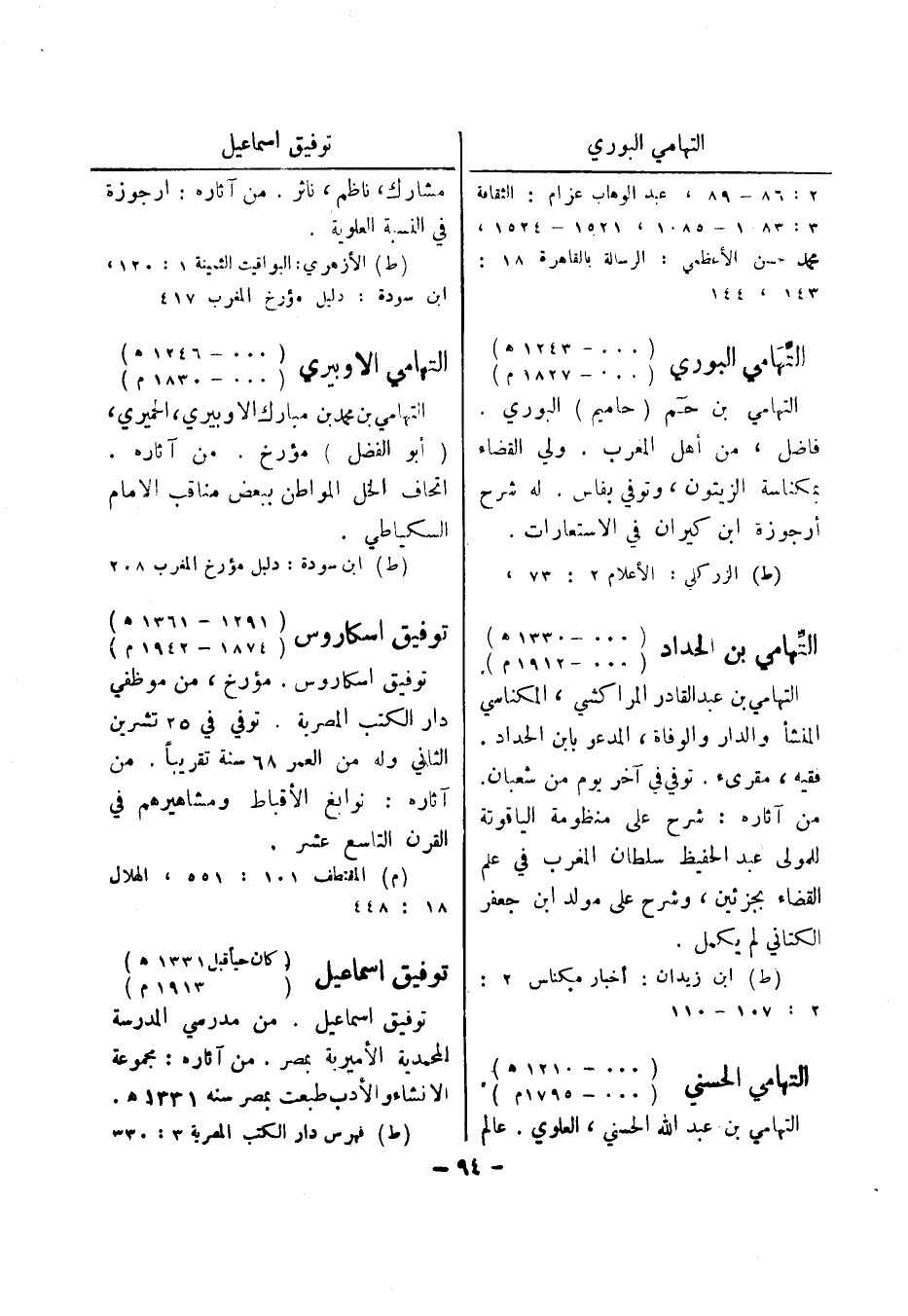 (ط) الزركلي: الاعلام 2: 73، التهامي بن الحداد (000 - 1330 هـ) (000 - 1912 م) التهامي بن عبد القادر المراكشي، المكناسي النشأ والدار والوفاة، المدعو بابن الحداد.
