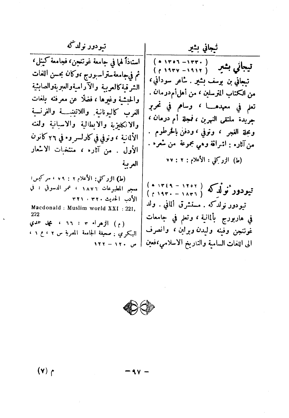 (ط) الزركلي: الاعلام: 2: 77 تيودور نولدكه (1252 - 1349 هـ) (1836 - 1930 م) تيودور نولدكه.