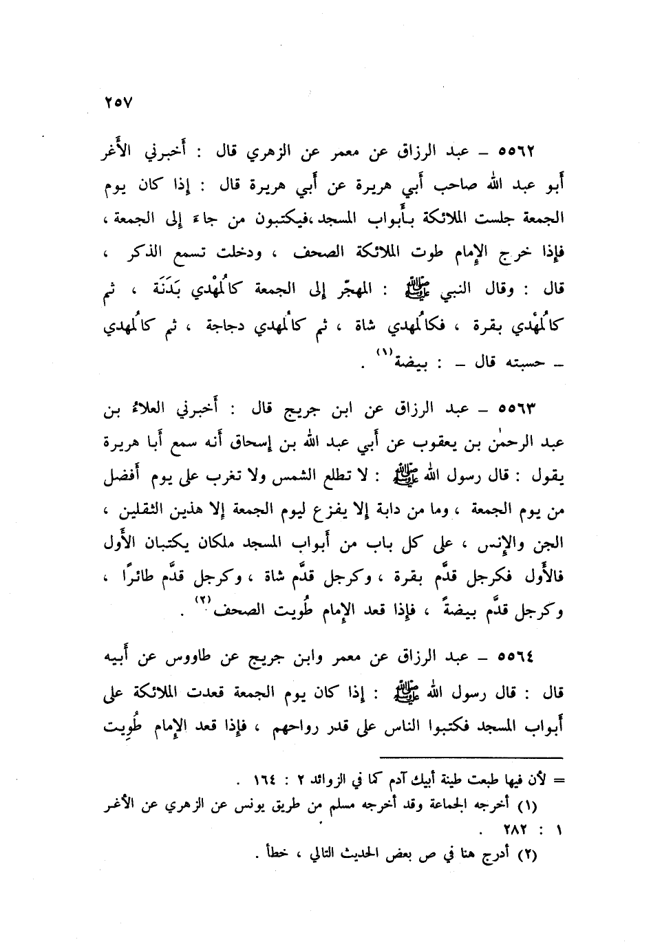 ٥٥٦٤ - عَبْدُ الرَّزَّاقِ، عَنْ مَعْمَرٍ، وَابْنِ جُرَيْجٍ، عَنْ طَاوُسٍ، عَنْ أبيه قَالَ: قَالَ رَسُولُ اللَّهِ صَلَّى اللهُ عَلَيْهِ وَسَلَّمَ: «إِذَا كَانَ يَوْمُ الْجُمُعَةِ قَعَدَتِ الْمَلَائِكَةُ عَلَى أَبْوَابِ الْمَسْجِدِ، فَكَتَبُوا النَّاسَ عَلَى قَدْرِ رَوَاحِهِمْ، فَإِذَا قَعَدَ الْإِمَامُ طُوِيَتِ ⦗٢٥٨⦘ الصُّحُفُ وَانْقَطَعَتِ الْفَضَائِلُ، فَمَنْ جَاءَ حِينَئِذٍ فَإِنَّمَا يَأْتِي لِحَقِّ الصَّلَاةِ، فَفَضْلُهُمْ كَفَضْلِ صَاحِبِ الْجَزُورِ عَلَى صَاحِبِ الْبَقَرَةِ وَعَلَى صَاحِبِ الشَّاةِ»